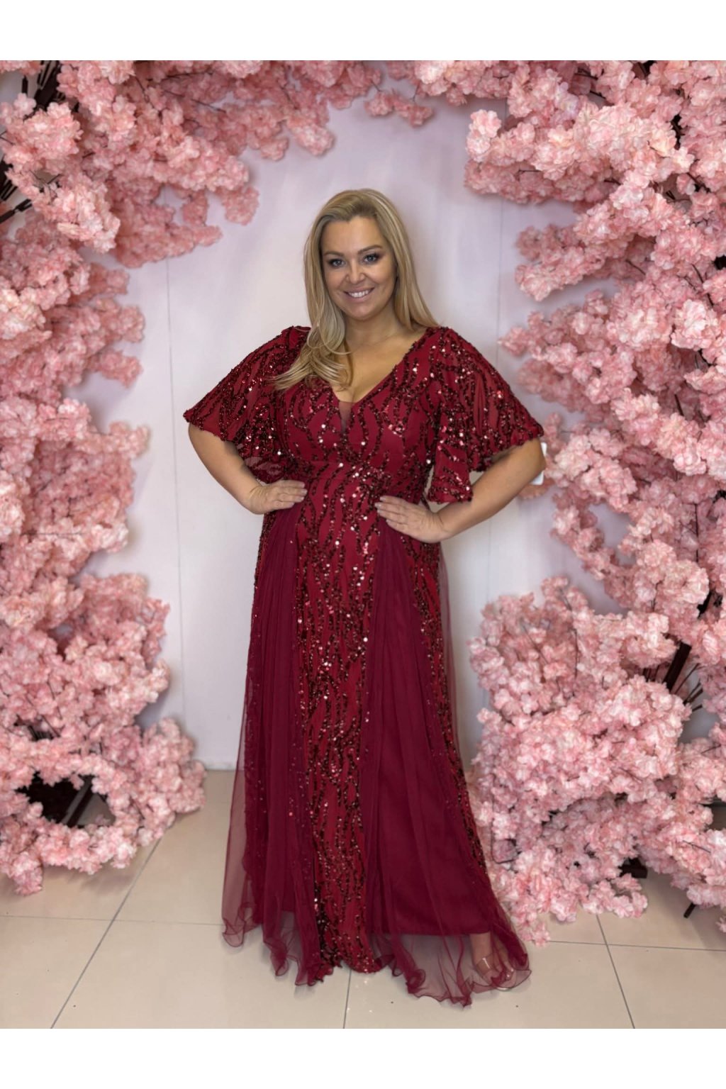 Dlhé spoločenské bordové šaty s flitrami a tylom