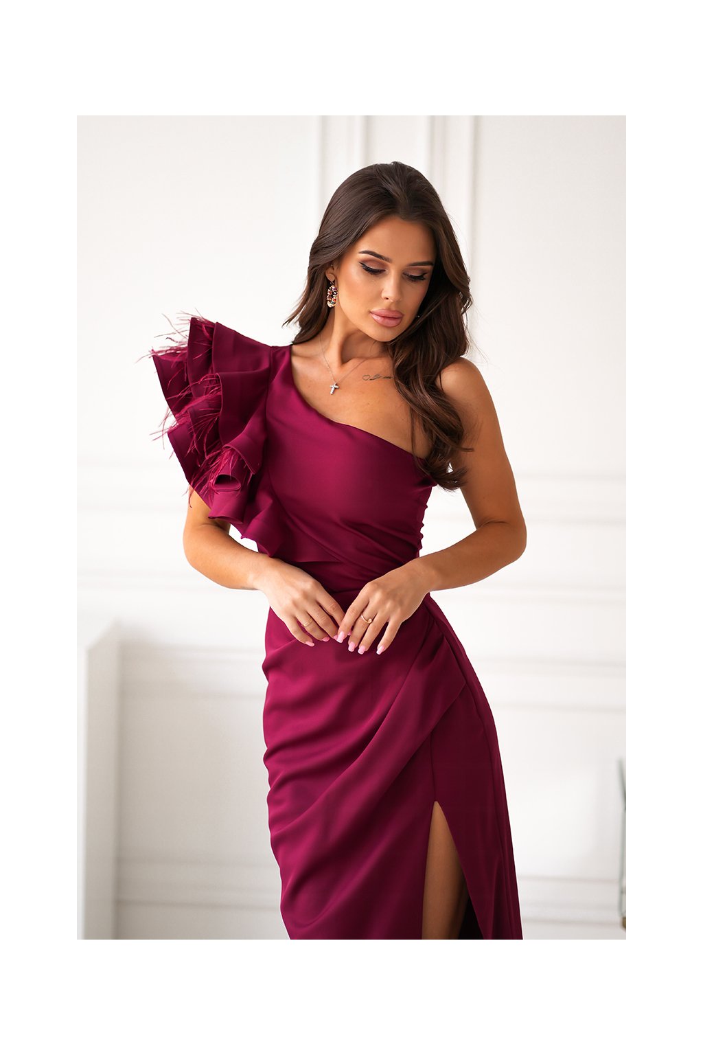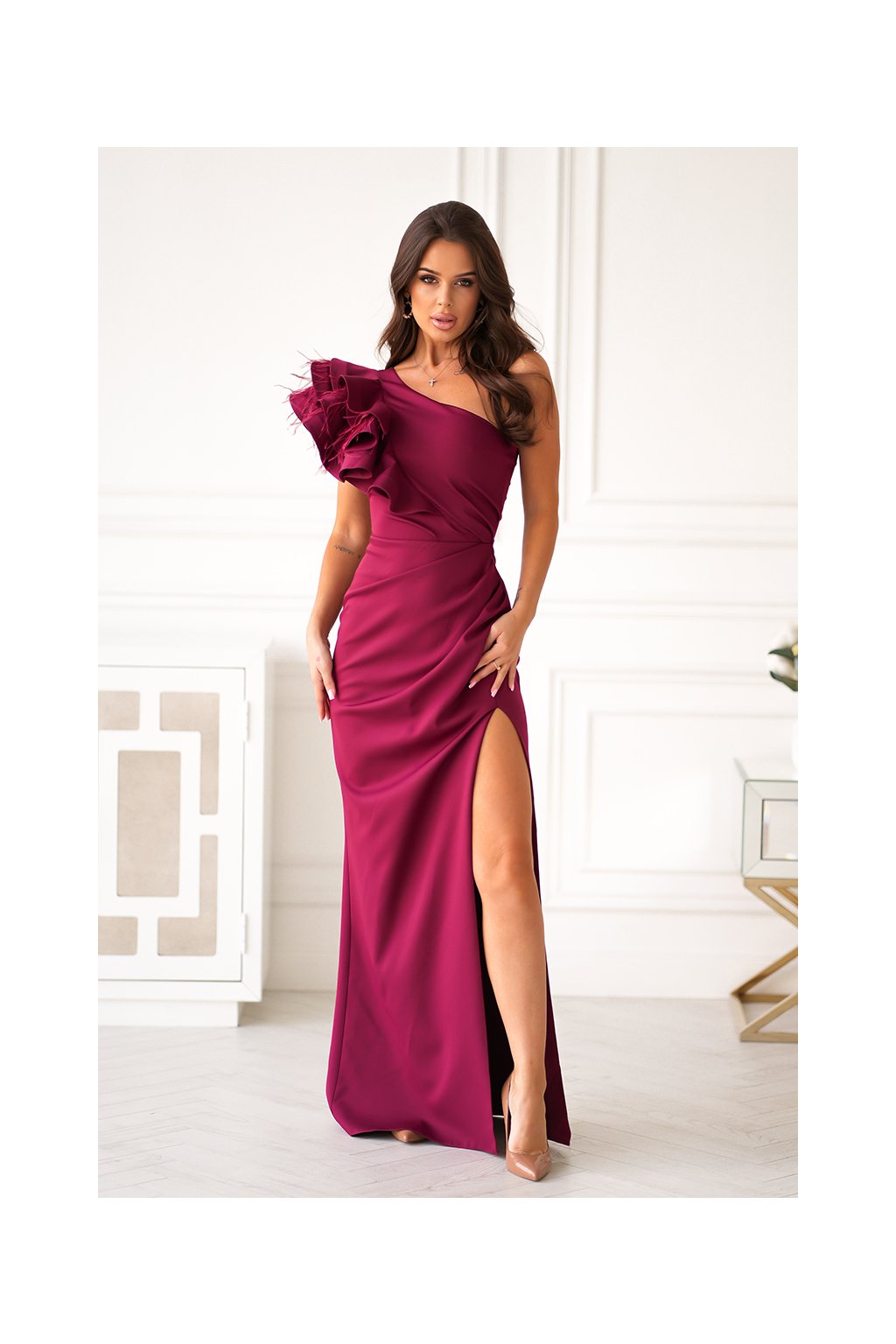 Exkluzívne priliehavé šaty s dominantným volánom cez jedno rameno vám padnú do oka už na prvý pohľad. Volán je doplnený jemnými pierkami. Na prsiach nie sú vystužené. Sukňa je priliehavá a na jednej strane má rázporok. Šaty sa zapínajú zozadu pomocou zipsu.