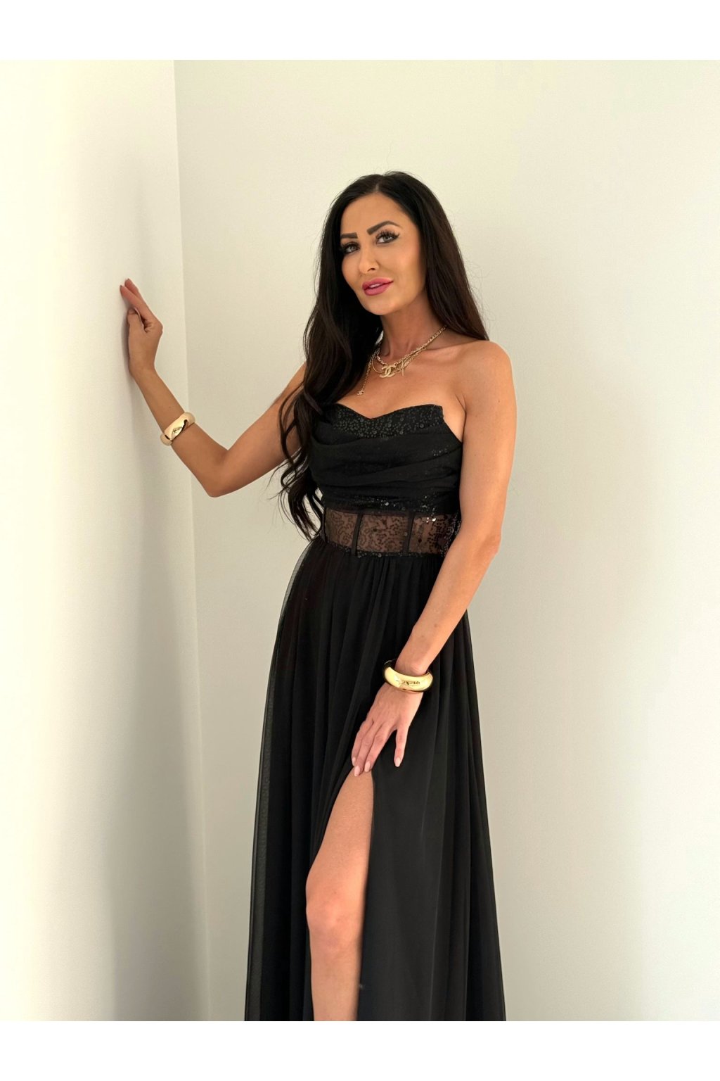 Dlhé spoločenské čierne korzetové šaty s tylovou sukňou