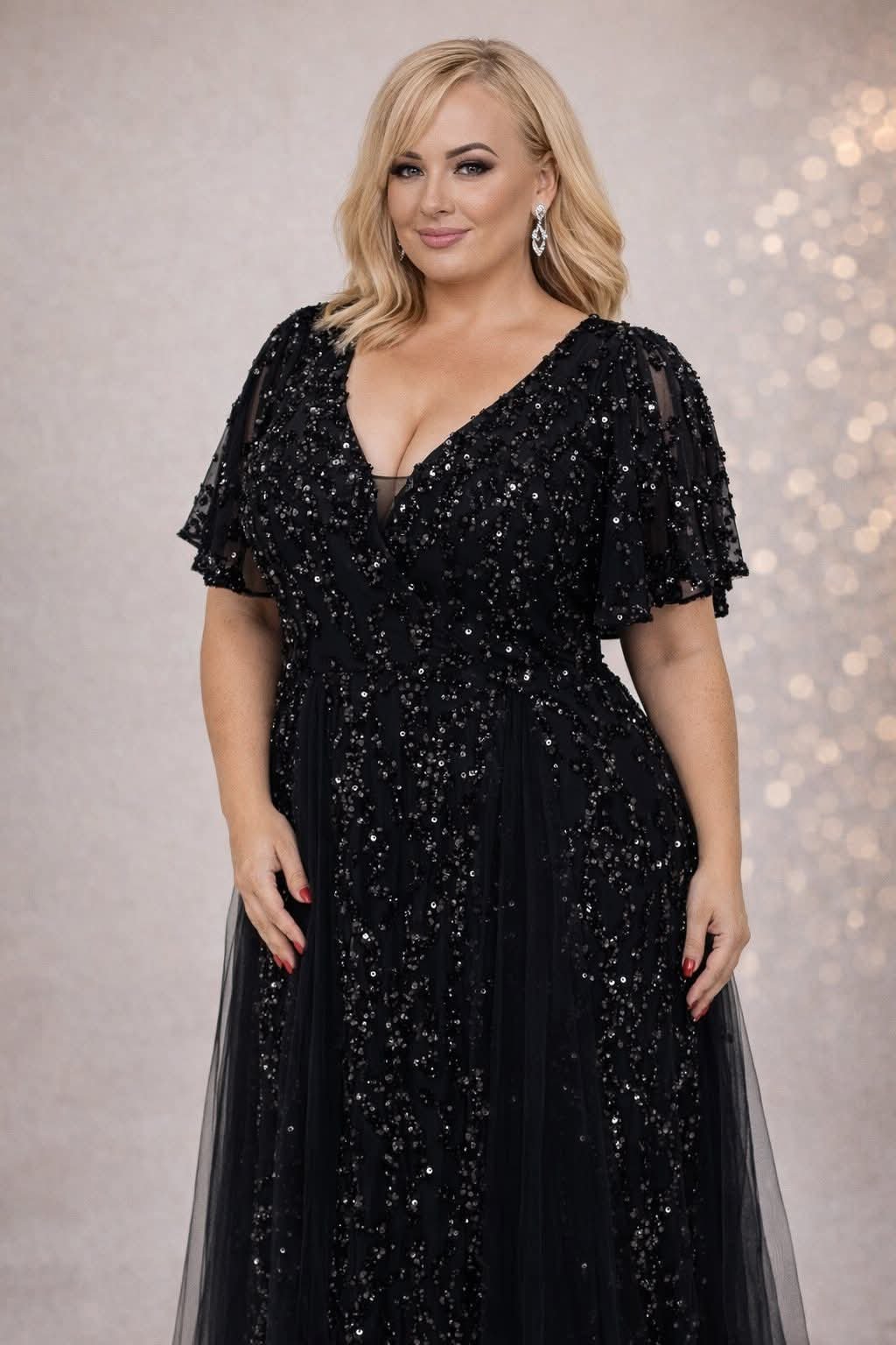 V týchto žiarivých flitrovaných šatách pritiahnete na seba všetkú pozornosť! Či už vás čaká večierok, ples alebo oslava, tieto šaty sa hodia na všetko. Šaty majú dve vrstvy - mäkkú podšívku a druhá vrstva je z flitrov. Majú rukáv a vpredu aj vzadu majú véčkový výstrih. Na prsiach sú šaty vystužené. Sukňa je priliehavá, doplnená typom. Zapínajú sa zozadu na zips.