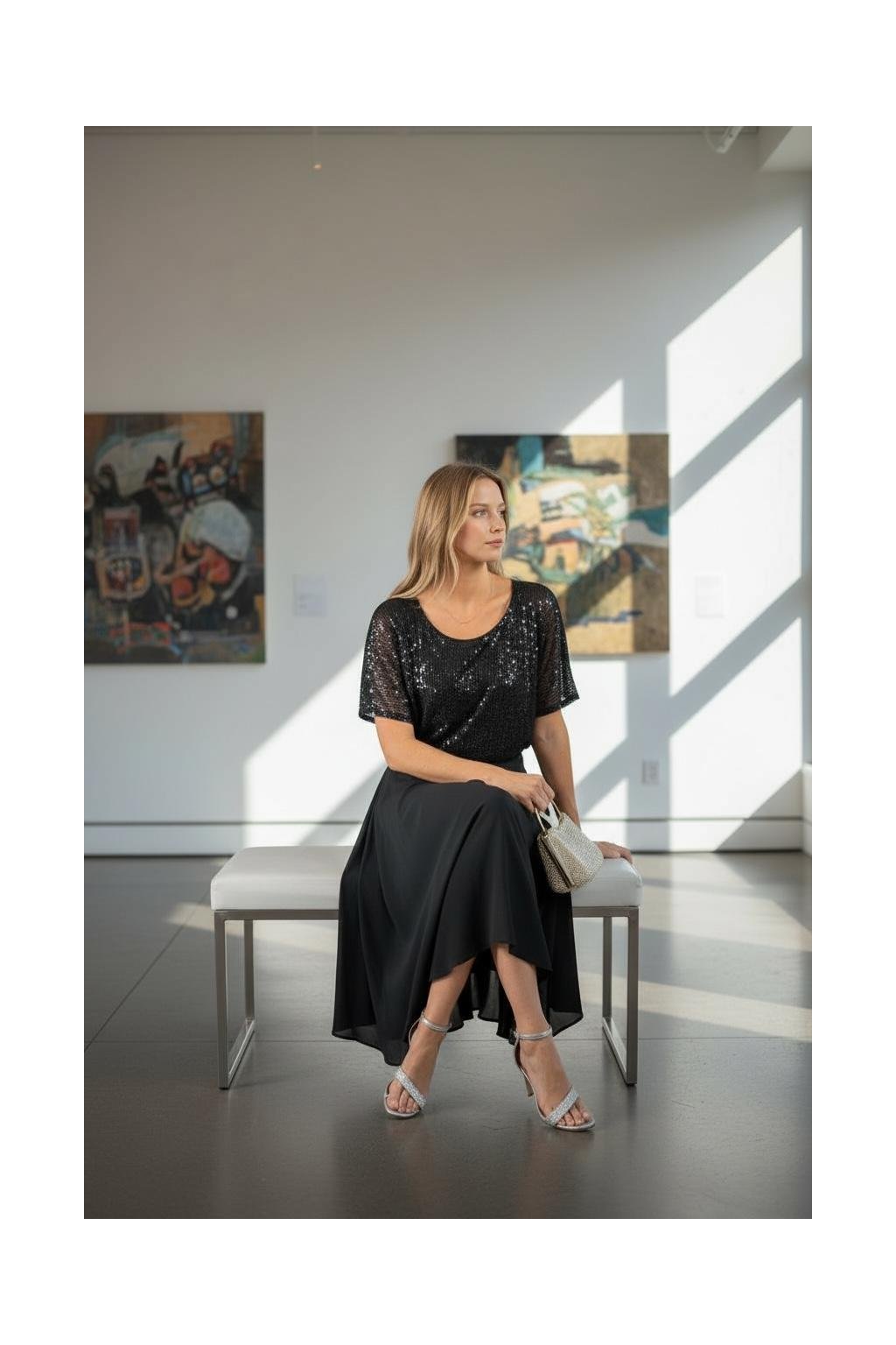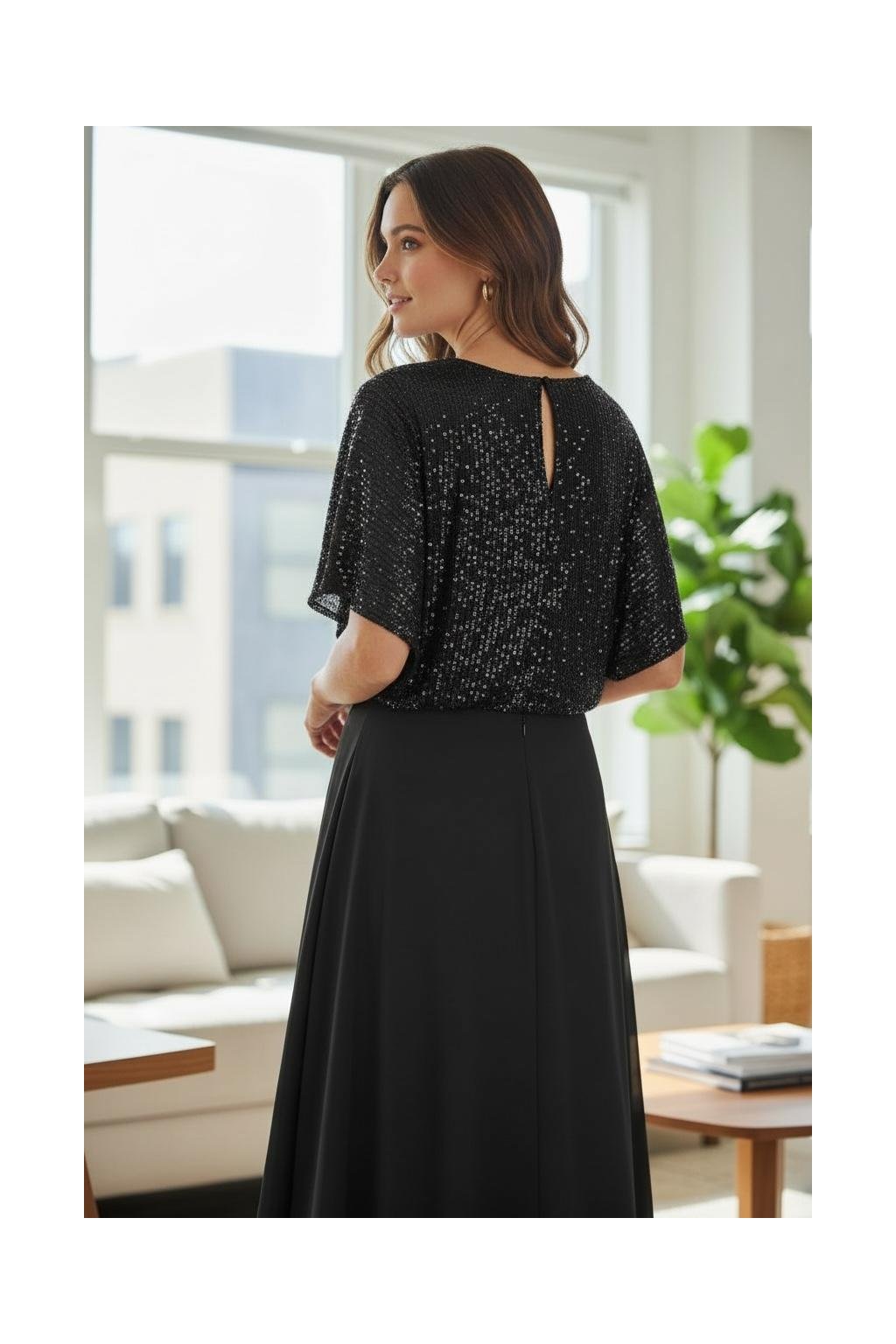 Jedinečné šaty s flitrovaným vŕškom sú skvelou voľbou na plesy, oslavy či iné spoločenské udalosti. Celý vrch je flitrovaný a majú jemný rukáv. V páse je zlatá ozdoba. Sukňa je ľahučká, padavá a má spodnicu. Zapínajú sa zozadu na zips a na gombík na chrbte.