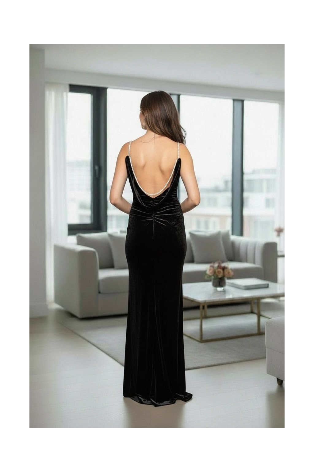 Dlhé spoločenské čierne zamatové šaty s odhaleným chrbtom