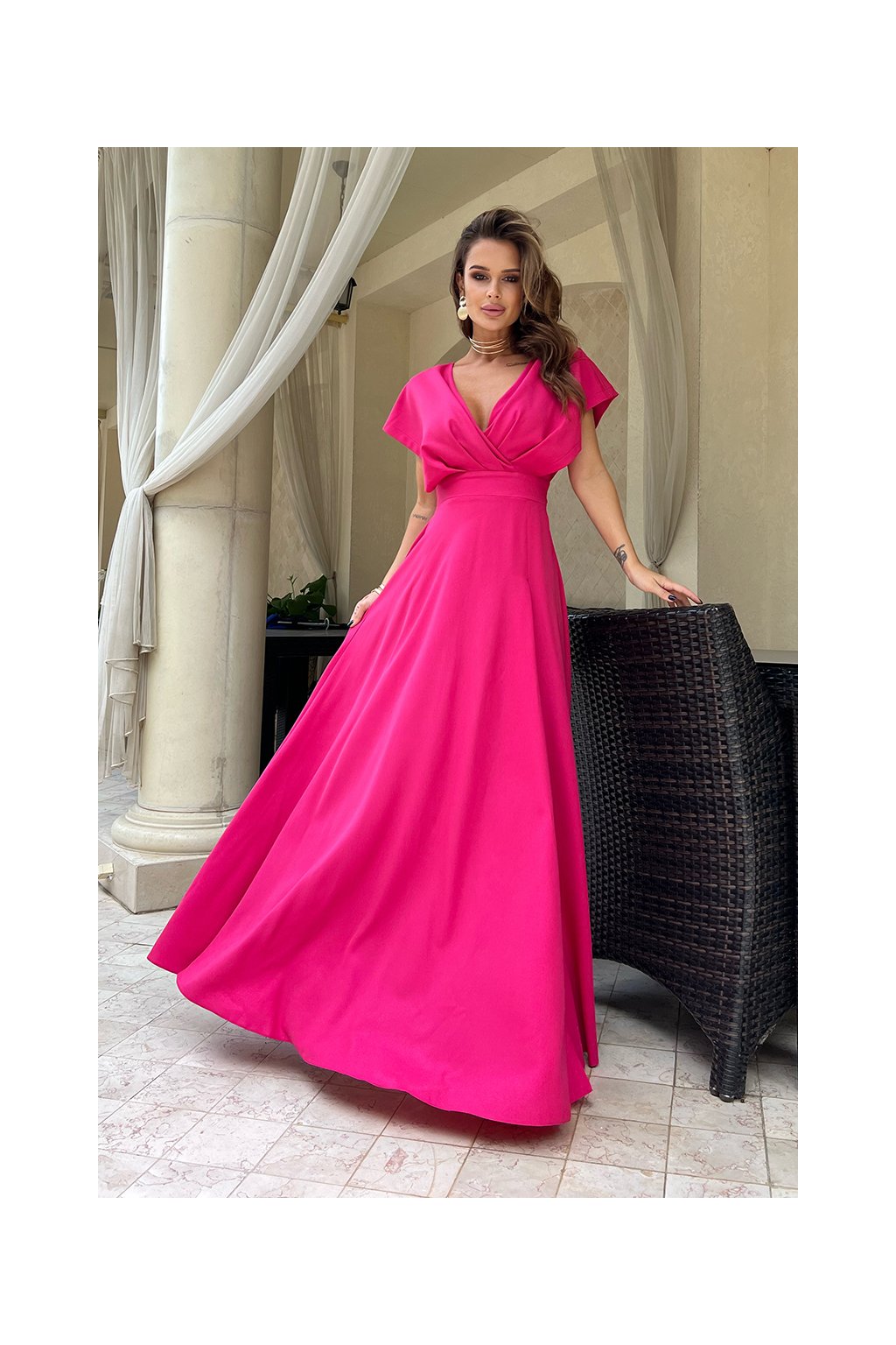 Dlhé spoločenské cyklámenové šaty so zakrytými ramenami