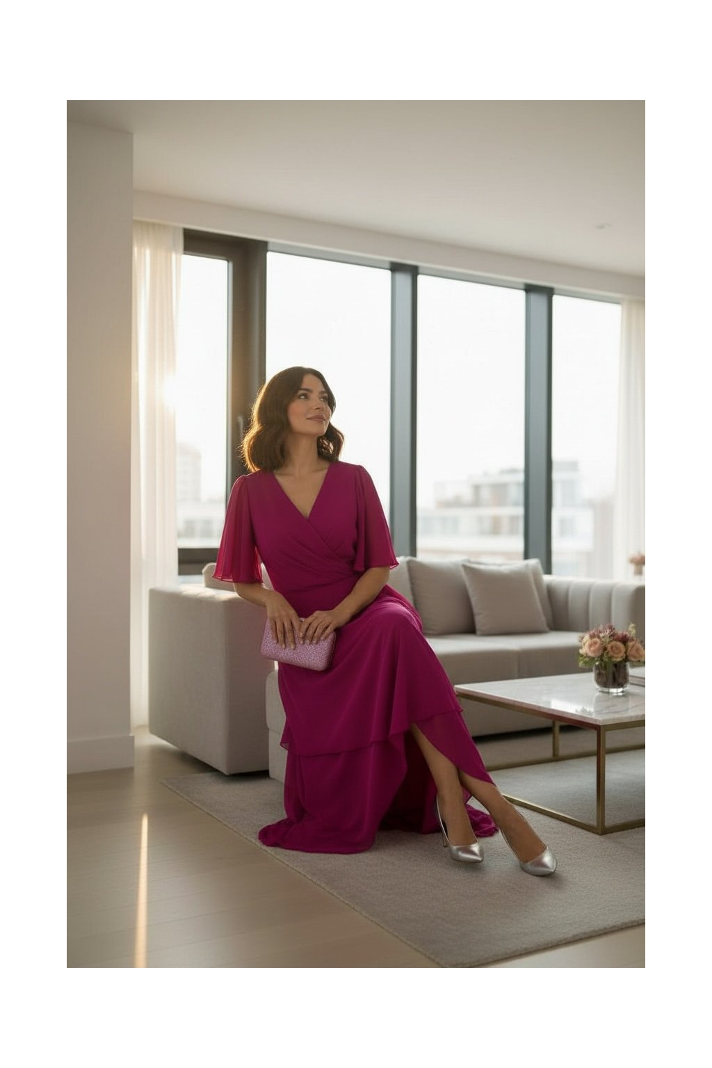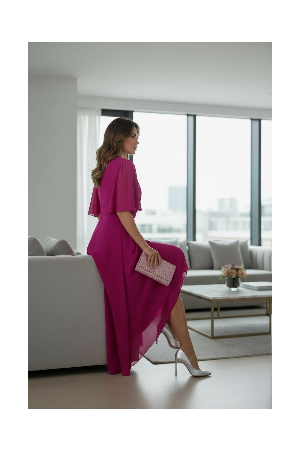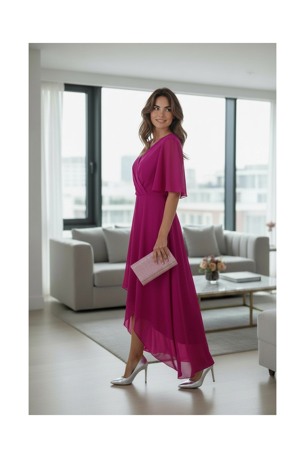 Tieto výnimočné šaty sú skvelou voľbou na svadbu či inú spoločenskú udalosť. Sú z príjemného ľahučkého šifónu, pod ktorým je mäkká spodnica. Majú prekladaný véčkový výstrih a na prsiach nie sú vystužené. Šaty majú aj ľahký šifónový rukáv. Sukňa je asymetrická. Na chrbte je véčkový výstrih. Zapínajú sa zozadu na zips.