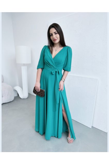 Objavte tieto výnimočné dlhé šaty a stavte na eleganciu a pohodlie. Celé šaty sú zo šifónu, pod ktorým je mäkká a príjemná podšívka. Prekladaný véčkový výstrih urobí pekný dekolt. Šaty na prsiach nie sú vystužené. Trojštvrťový rukáv je na konci ukončený jemnou gumičkou. Sukňa je padavá a na jednej strane má rázporok. V páse sa viaže opasok, ktorý je ku šatám pripevnený. Zapínajú sa na chrbte na zips.