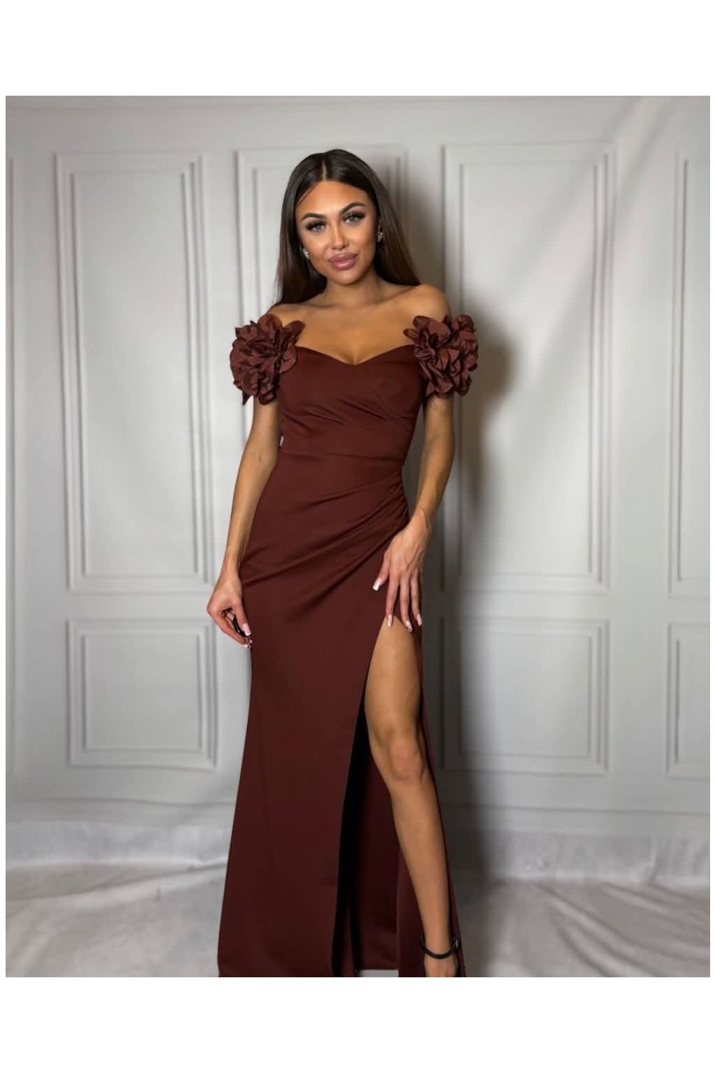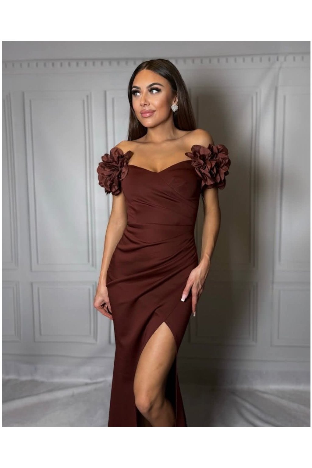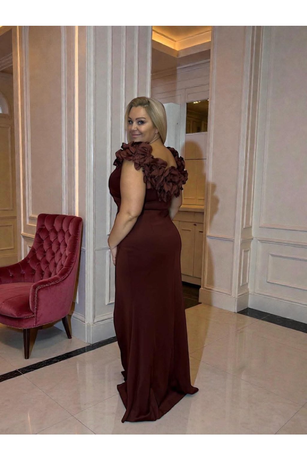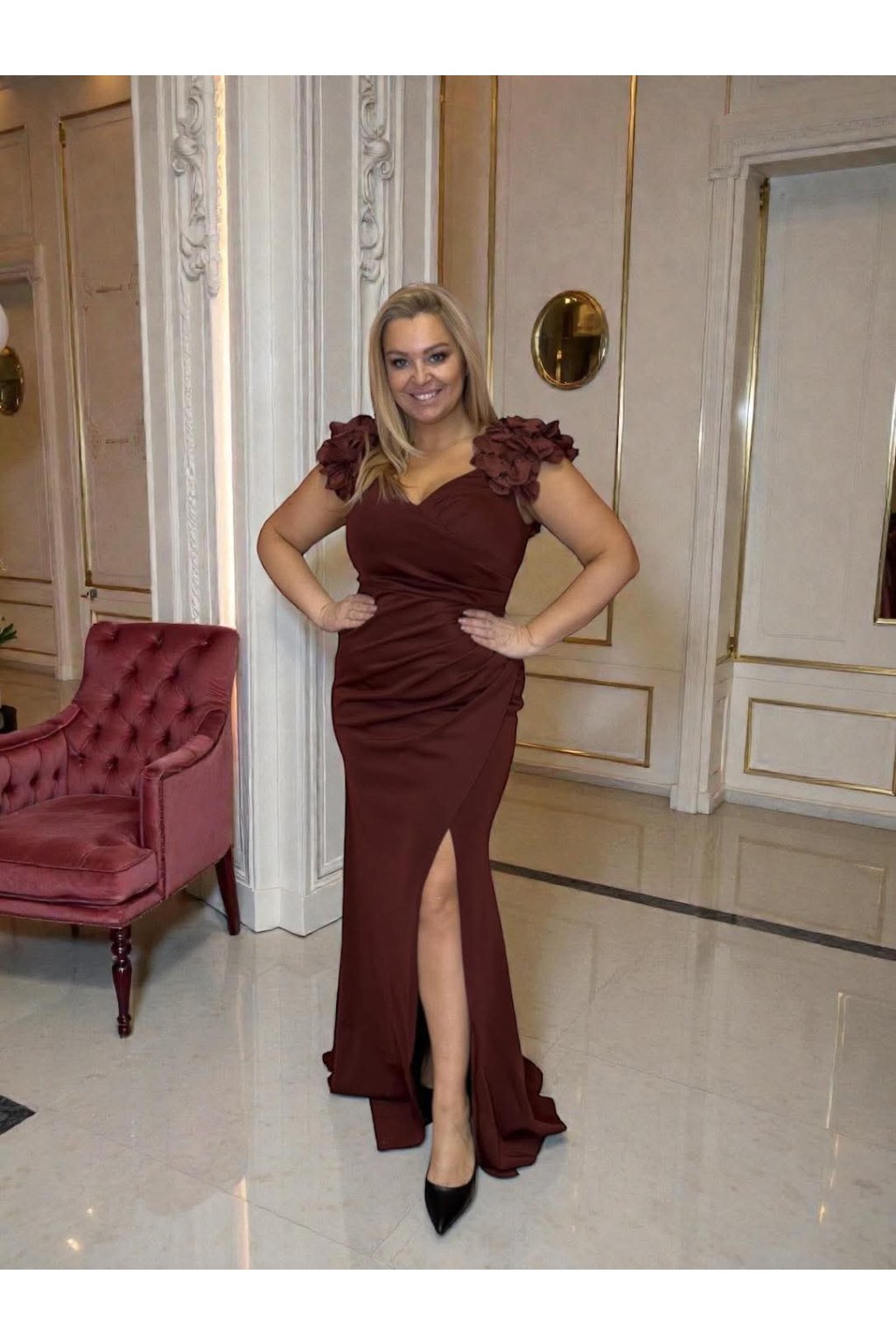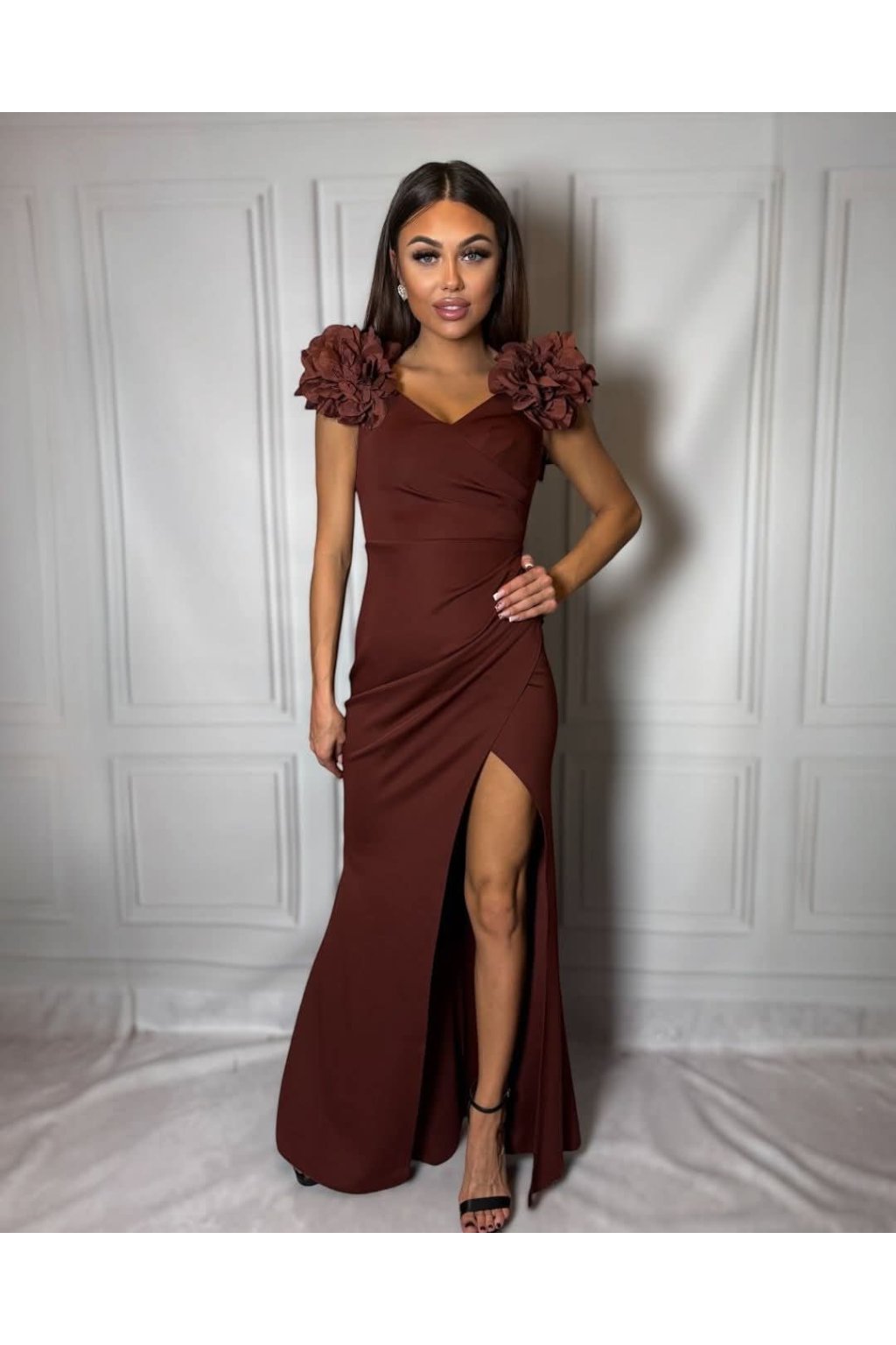 Tieto výnimočné spoločenské šaty v hlbokom čokoládovo-hnedom odtieni sú stelesnením ženskosti a elegancie. Priliehavý strih krásne zvýrazňuje siluetu, zatiaľ čo rafinovaný výstrih jemne podčiarkuje dekolt. Dominantným detailom sú bohato zdobené kvetinové rukávy, ktoré dodávajú šatám luxusný a romantický vzhľad.