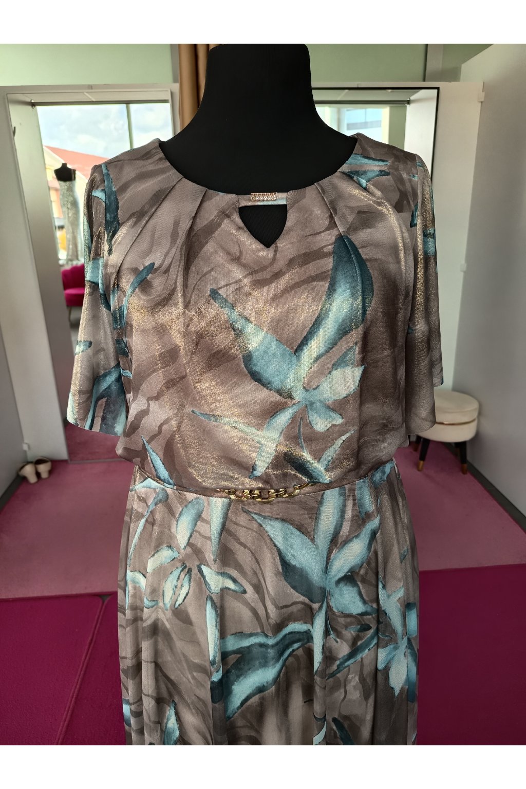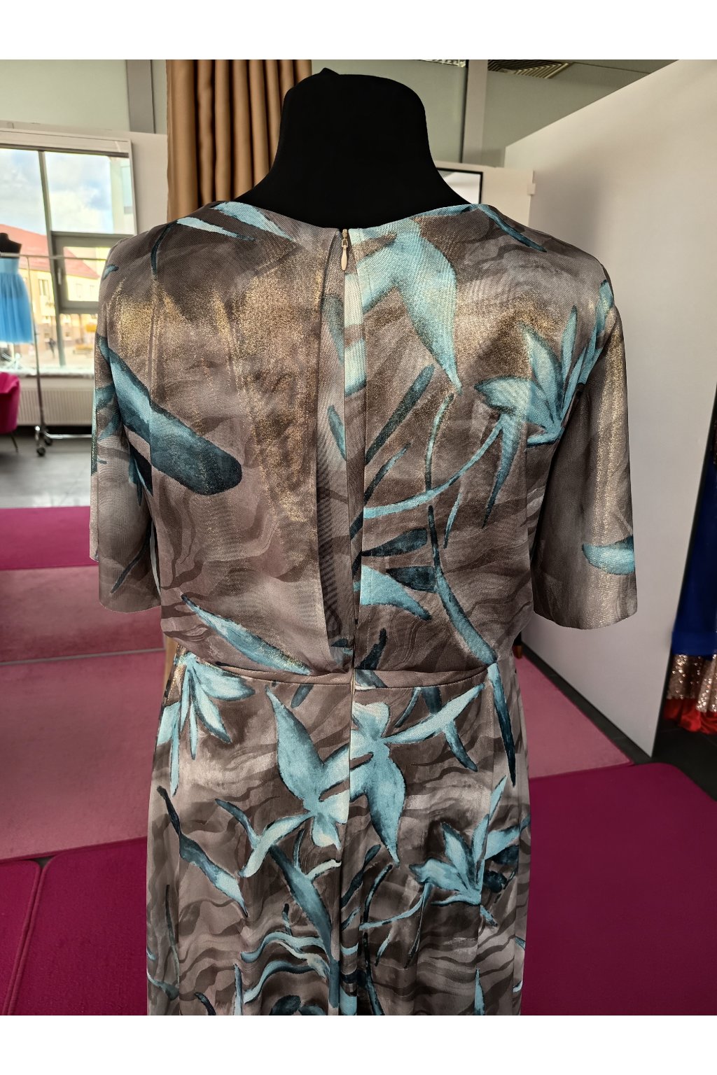 Jedinečné vzorované šaty sú skvelou voľbou na svadby, oslavy či iné spoločenské udalosti. Majú jemný volánový rukáv a na dekolte majú zlatú ozdobu. Vrch šiat je tvorený akoby "prehozom", takže nebude vidieť prípadné nedokonalosti. V páse je taktiež zlatá ozdoba. Sukňa je ľahučká, padavá a má spodnicu. Zapínajú sa zozadu na zips.