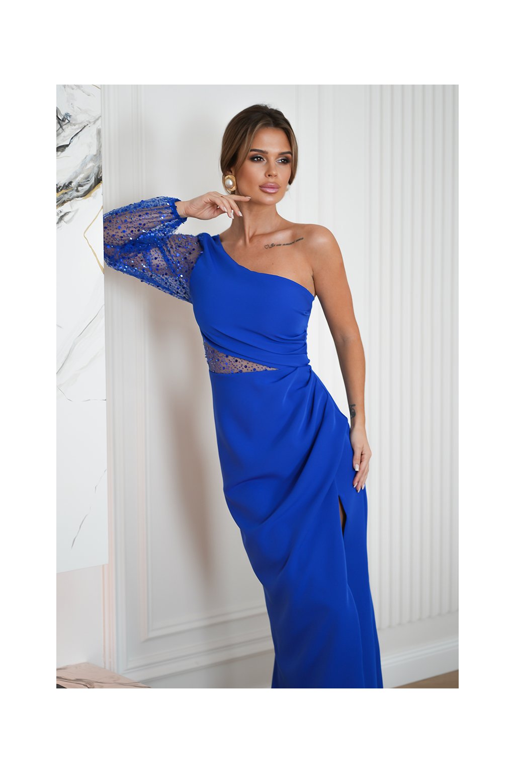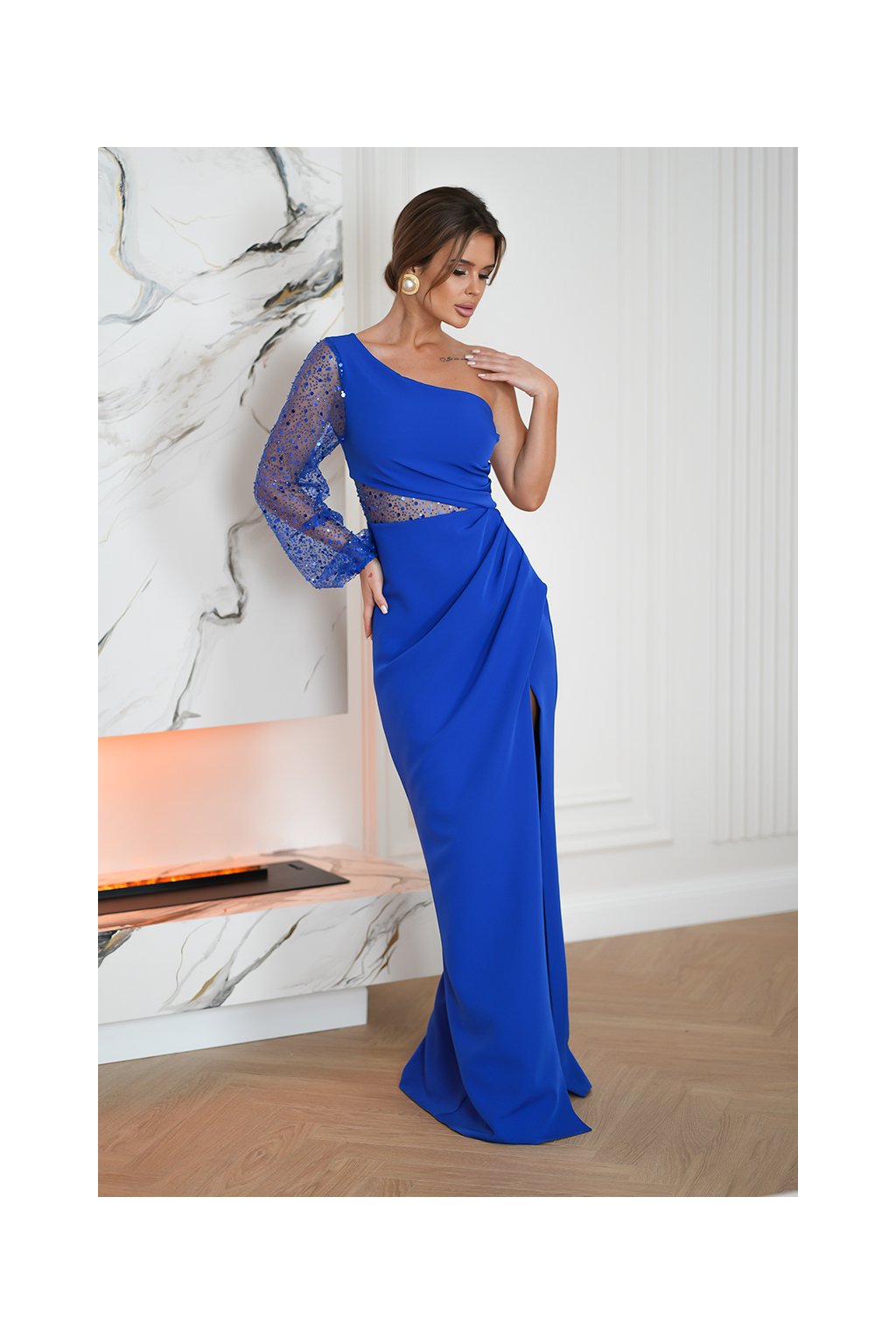 Dlhé spoločenské kráľovsky modré flitrované šaty na jedno rameno
