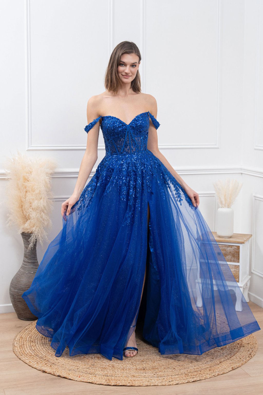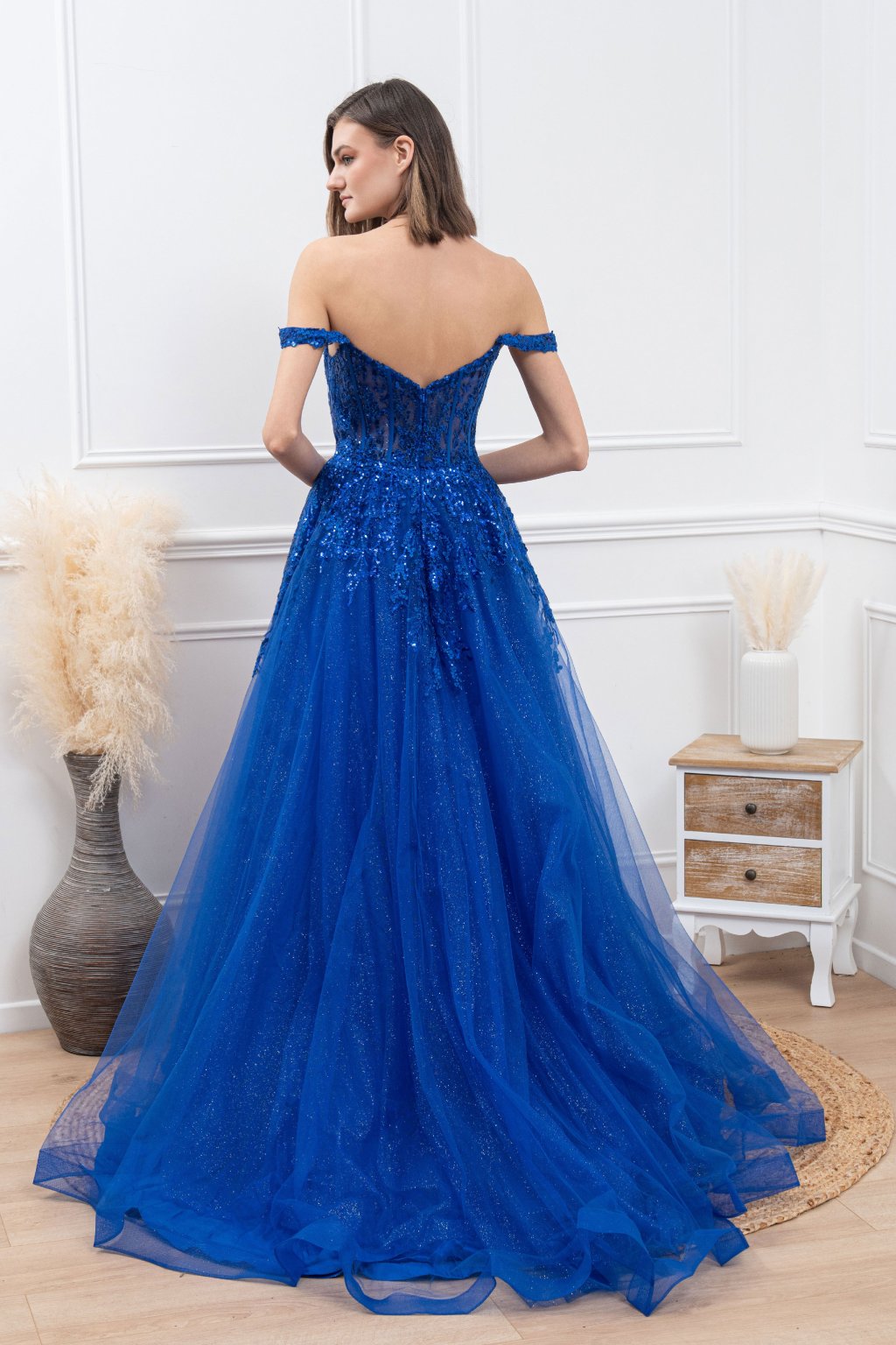 Dlhé spoločenské kráľovsky modré korzetové šaty s padnutými ramenami a tylom