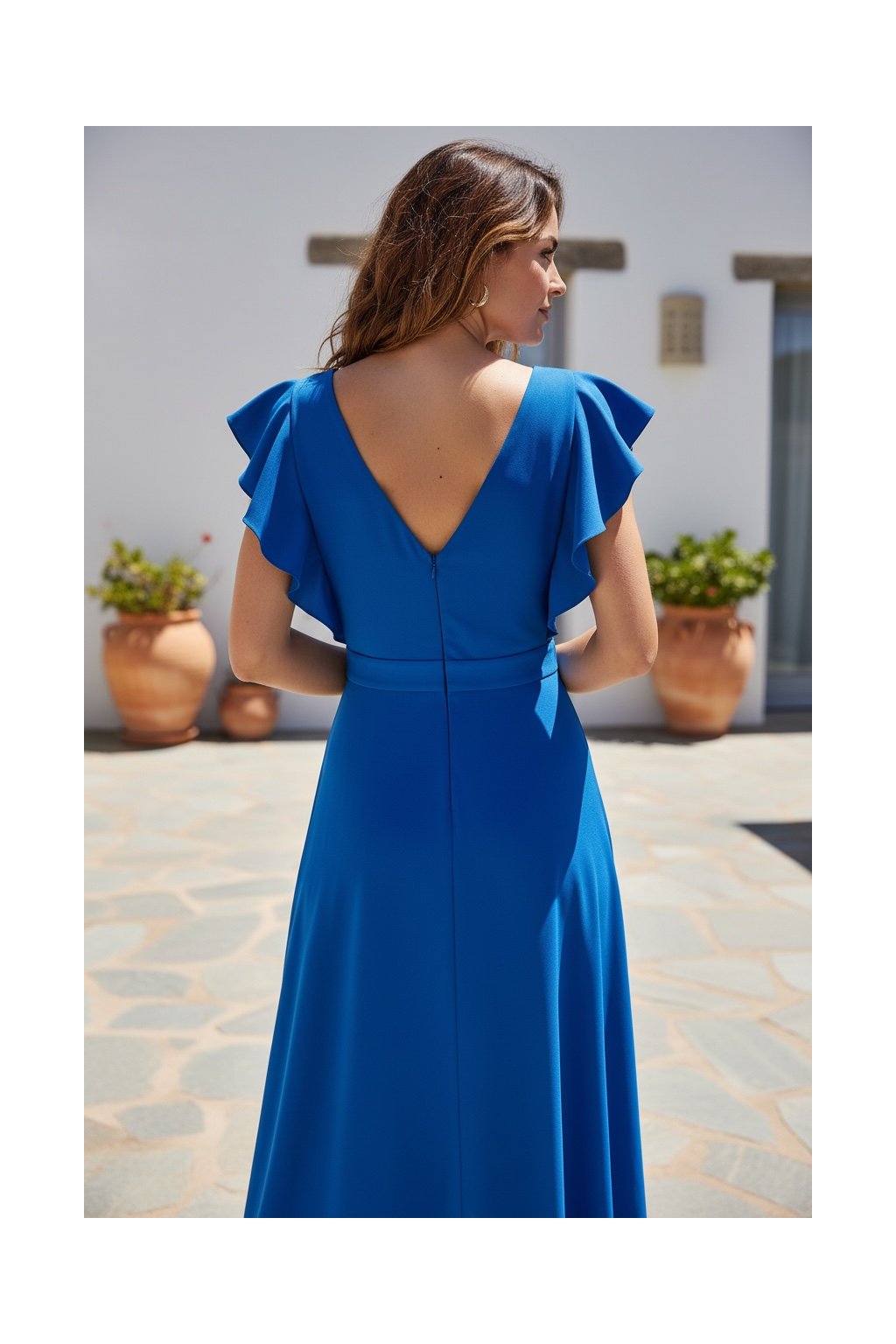 Tieto výnimočné dlhé šaty sú skvelou voľbou na svadbu či inú spoločenskú udalosť. Véčkový výstrih je vpredu aj zozadu šiat. Šaty nie sú na prsiach vystužené. Neprehliadnuteľné a trendy volány tvoria jemný rukáv. Sukňa je dlhá, padavá a na jednej strane má rázporok. Zapínajú sa zozadu na zips. Súčasťou šiat je neodnímateľný opasok.