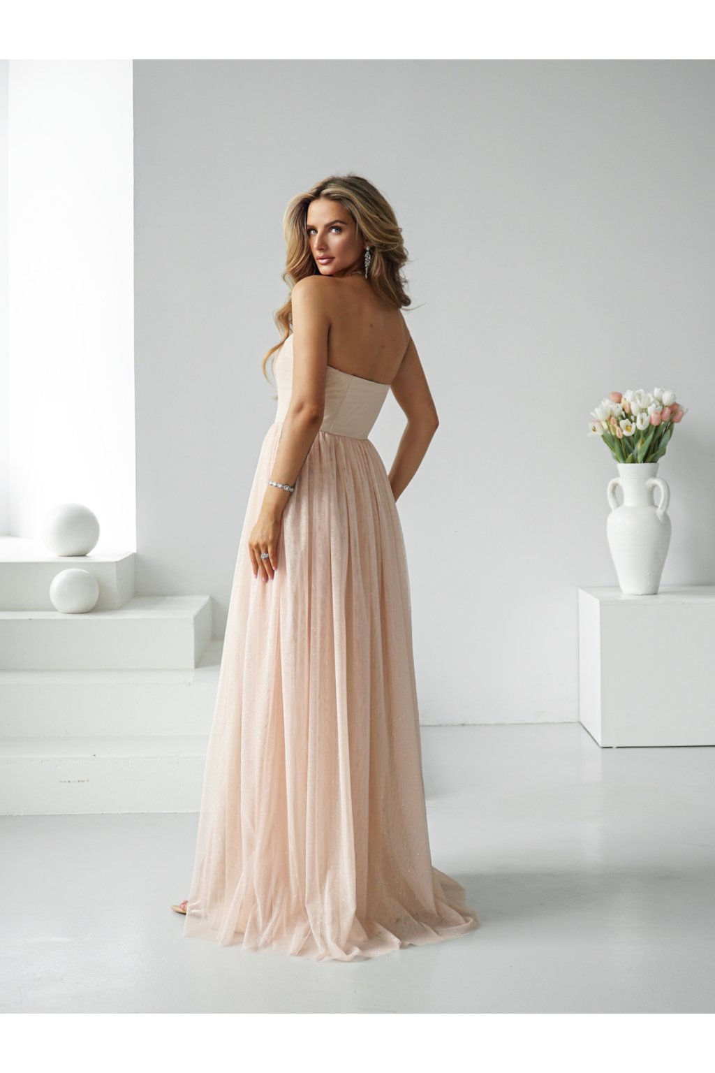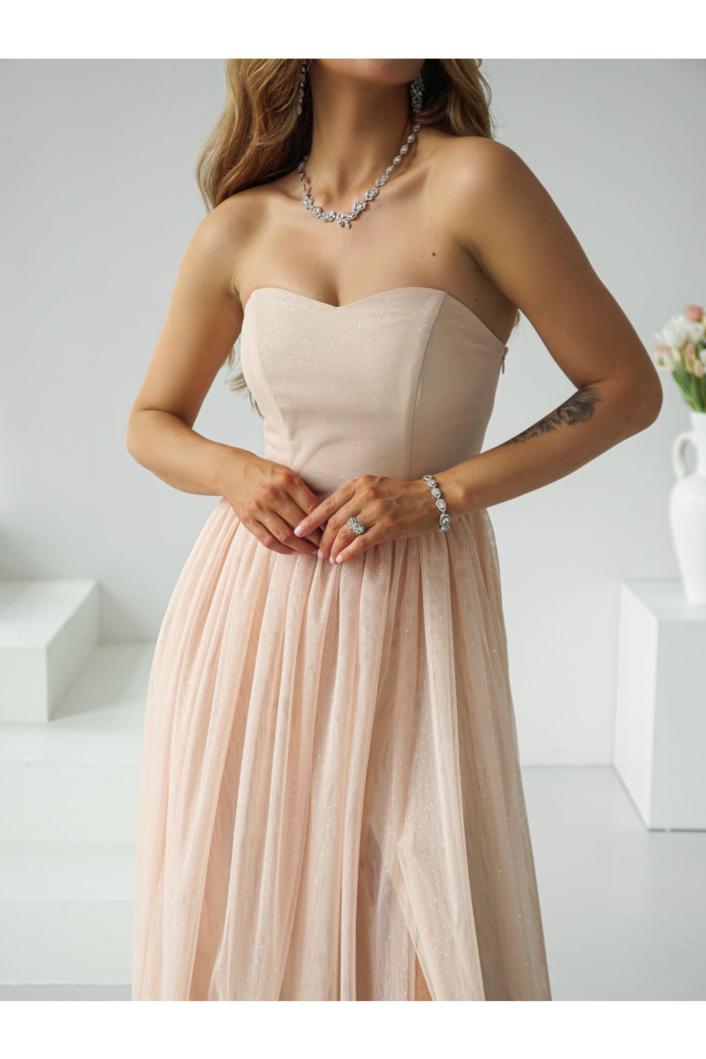 Exkluzívne trblietavé tylové šaty v strihu bez ramienok vás zaujmú už na prvý pohľad. V týchto luxusných šatách budete zaručene kráľovnou celého večera. Vrch šiat je korzetový, na prsiach sú spevnené. Korzet je prekrytý tylovou trblietavou vrstvou. Zozadu je neviditeľná gumička, aby šaty lepšie držali. Sukňa je padavá s trblietavou tylovou vrstvou. Má rázporok. Zapínajú sa na boku na zips.