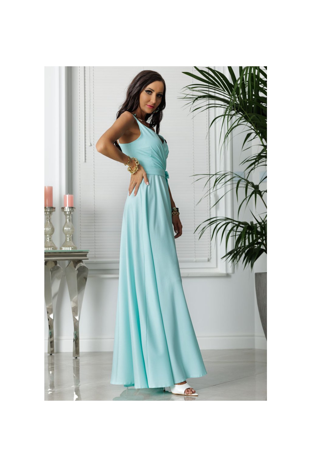 Dlhé spoločenské mentolové šaty na tenké ramienka