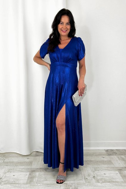 Dlhé spoločenské modré flitrované šaty s padnutými ramenami