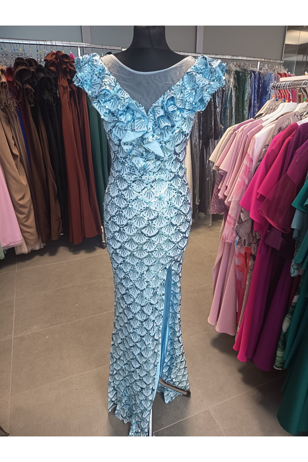 V týchto oslnivých a luxusných šatách budete kráľovnou plesu či inej udalosti. Vďaka svojmu jedinečnému strihu vás nikto neprehliadne. Celé šaty sú z flitrov, pod ktorými je mäkká podšívka. Výstrih na šatách lemuje jemný volán. Na dekolte je jemný tyl. Na prsiach sú vystužené. Sukňa je priliehavá a na jednej strane má rázporok. Na chrbte sa zapínajú na zips.