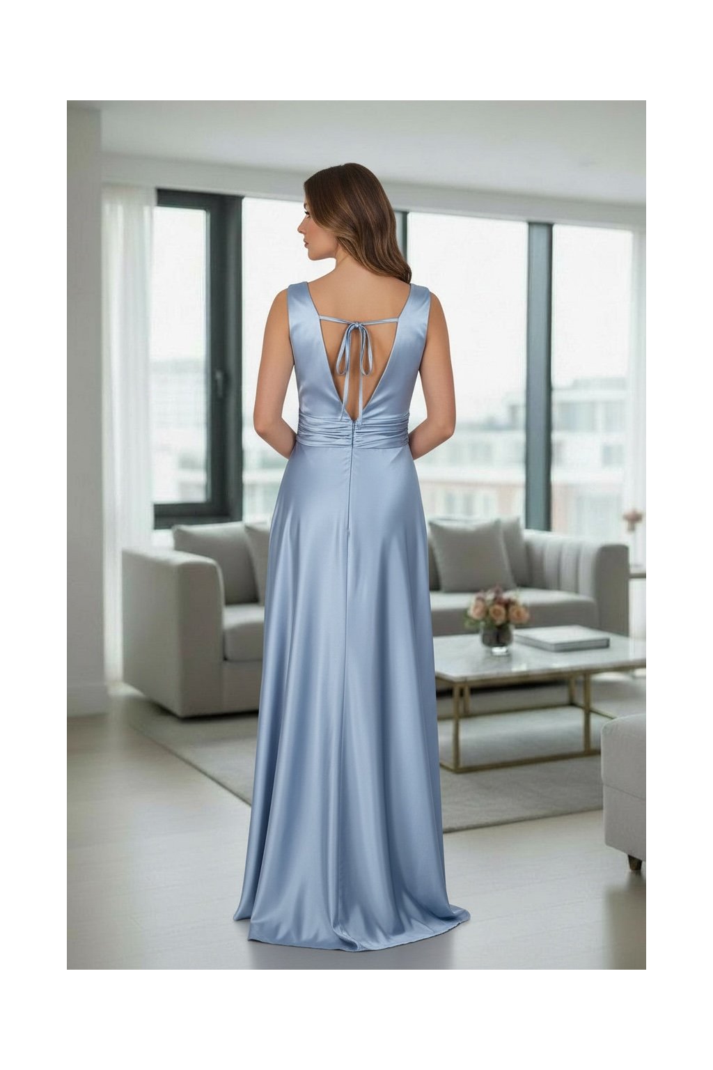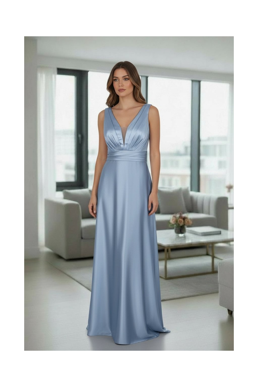 ✨ Dlhé spoločenské modré saténové šaty s riaseným pásom – elegantné šaty na svadbu, ples aj spoločenskú udalosť