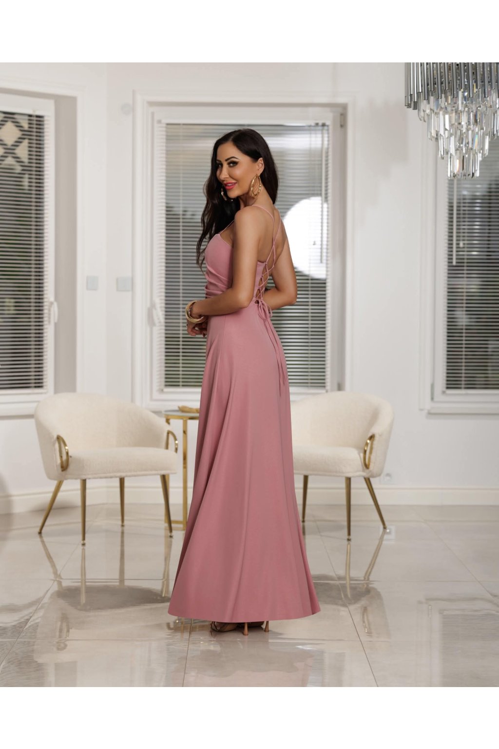 Dlhé spoločenské púdrovo-ružové šaty s viazaním
