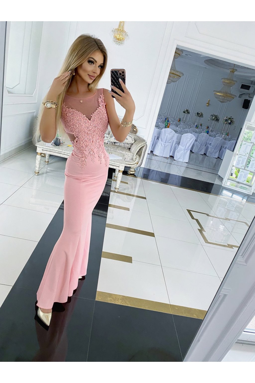 Dokonalé dlhé spoločenské šaty vhodné na svadbu, stužkovú či inú spoločenskú udalosť. Prednú časť šiat tvorí tyl s vyšívanou čipkou a kamienkami. Zozadu je len tyl a vyšívaná čipka. Šaty sú na prsiach vystužené. Sukňa je dlhá, priliehavá, v spodnej časti sa rozširuje. Zapínanie na chrbte pomocou zipsu.