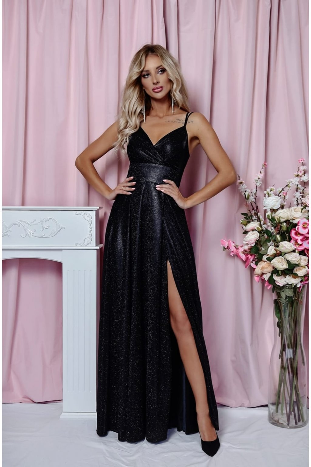 Dlhé spoločenské trblietavé čierne šaty na ramienka