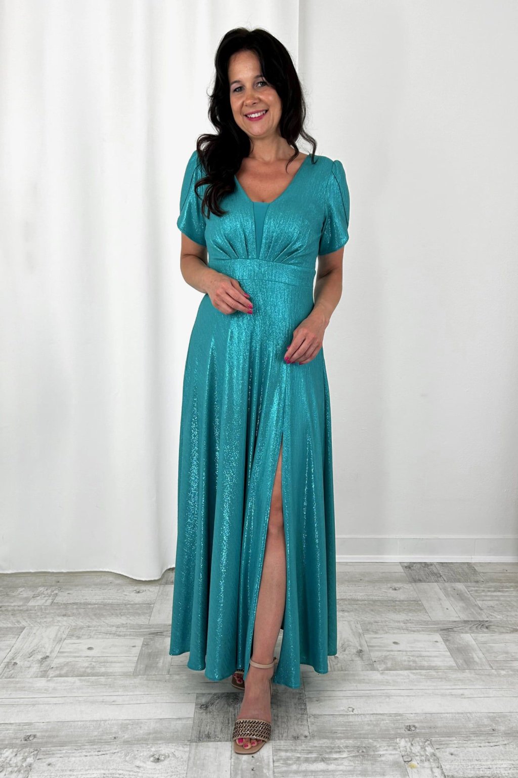 Jedinečné lesklé šaty sú skvelou voľbou na svadby, oslavy či iné spoločenské udalosti. Majú krátky rukáv a véčkový výstrih. Sukňa je padavá a má rázporok. Zapínajú sa zozadu na zips.