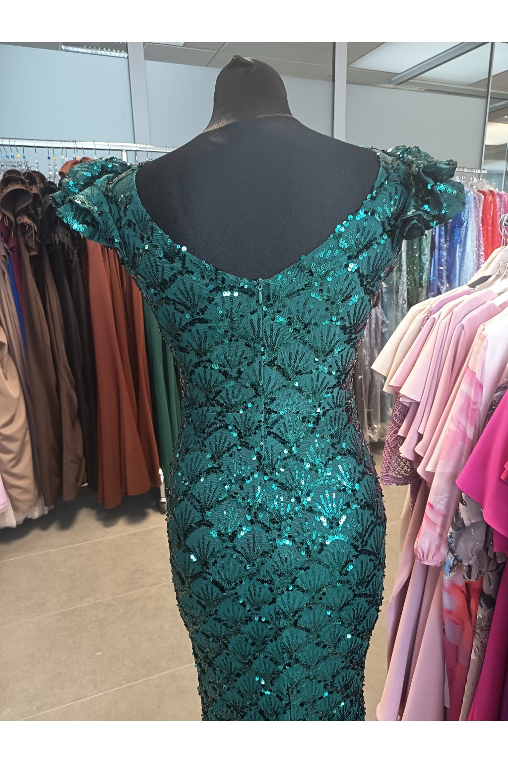 V týchto oslnivých a luxusných šatách budete kráľovnou plesu či inej udalosti. Vďaka svojmu jedinečnému strihu vás nikto neprehliadne. Celé šaty sú z flitrov, pod ktorými je mäkká podšívka. Výstrih na šatách lemuje jemný volán. Na dekolte je jemný tyl. Na prsiach sú vystužené. Sukňa je priliehavá a na jednej strane má rázporok. Na chrbte sa zapínajú na zips.