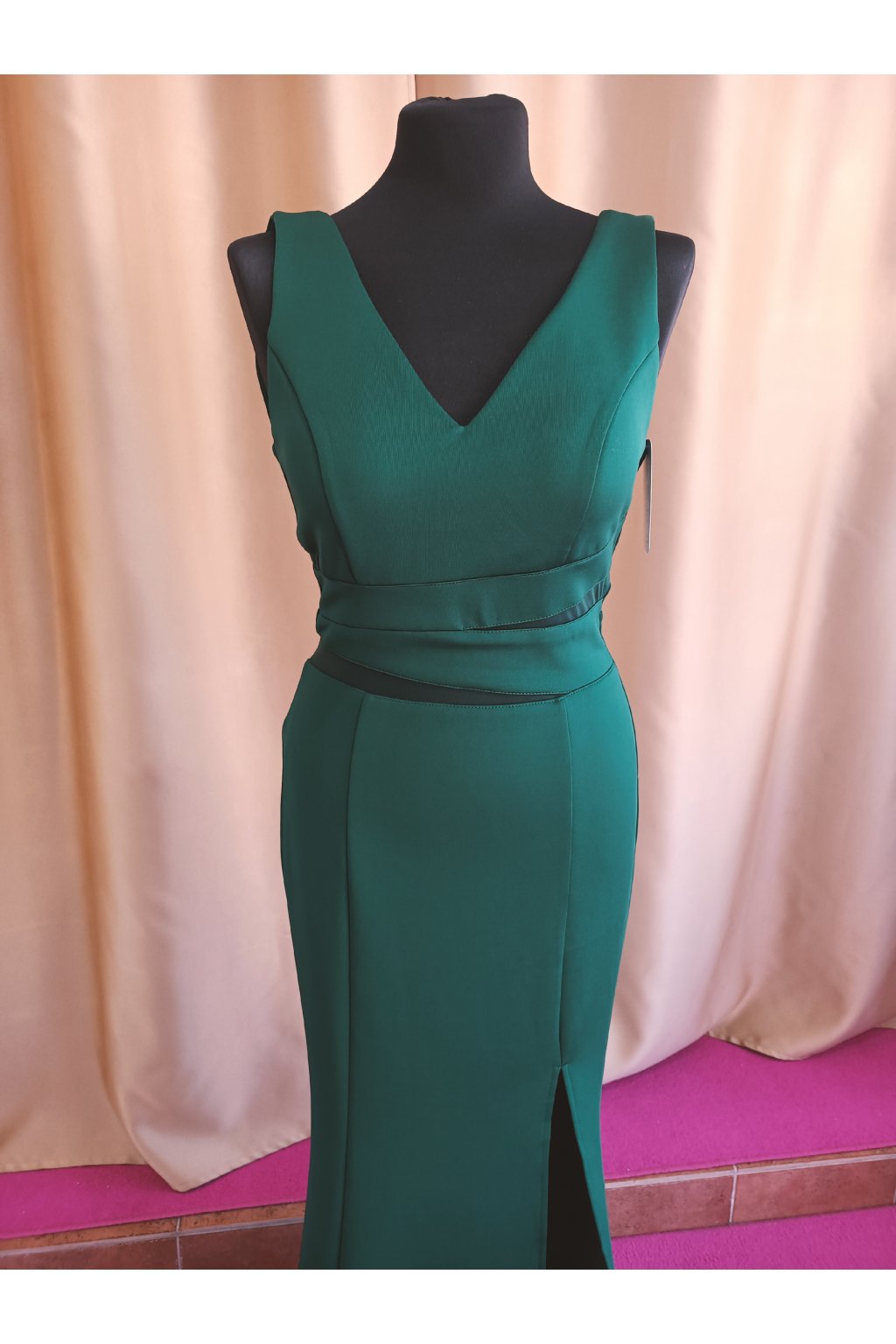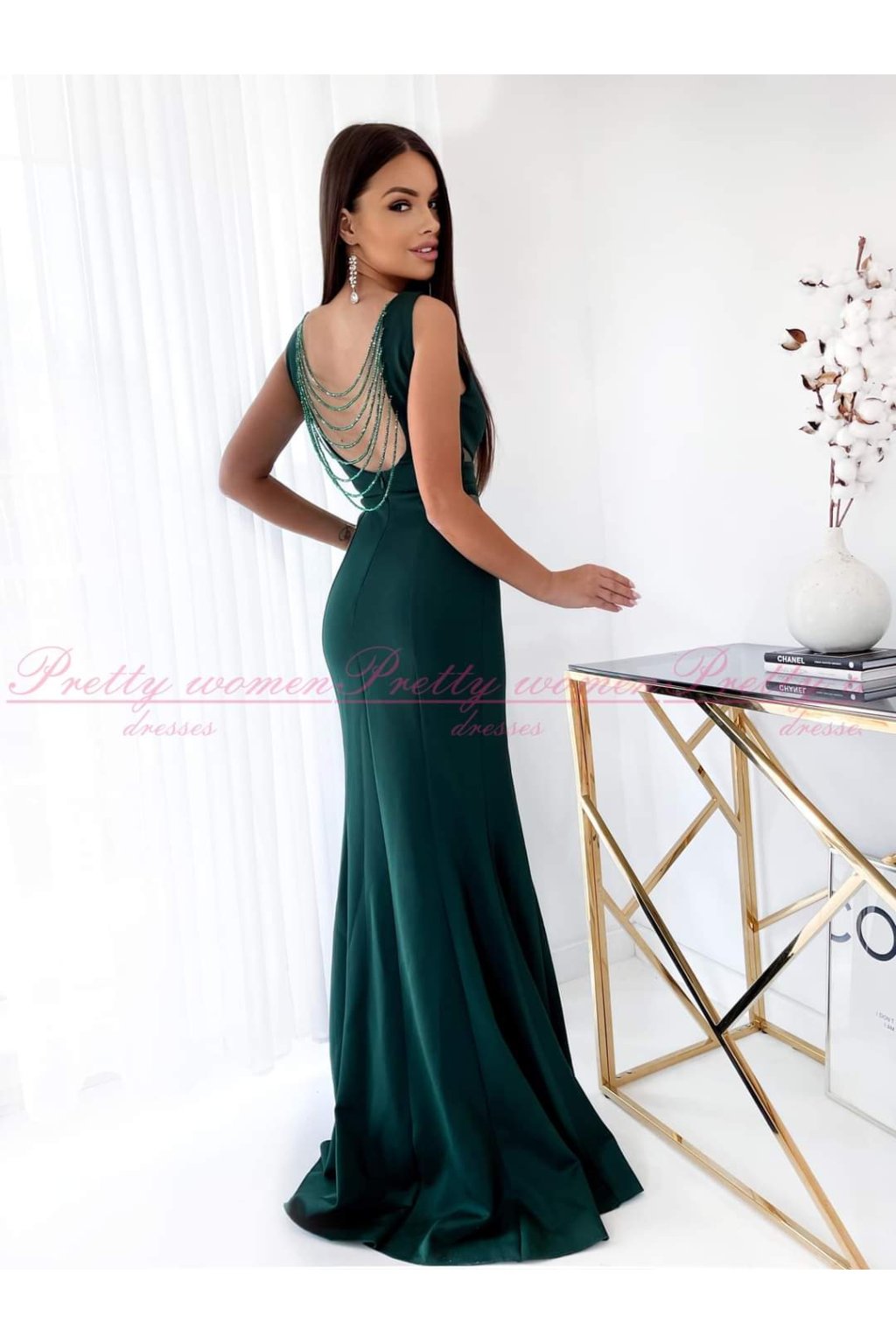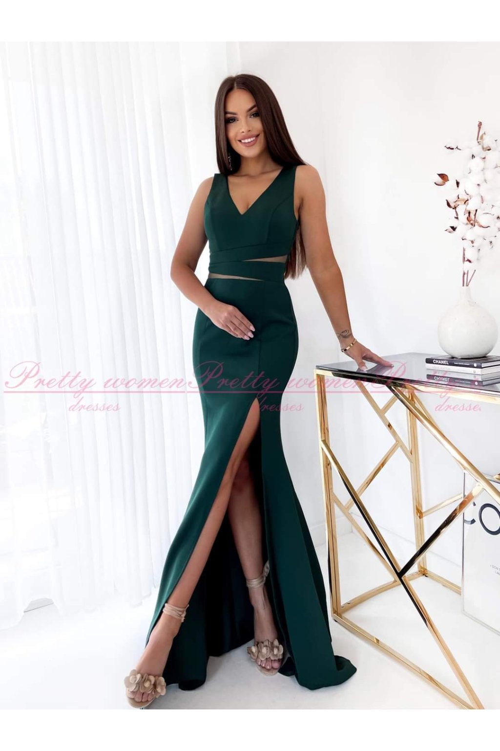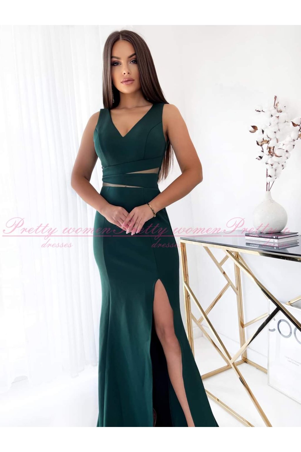 Exkluzívne dlhé priliehavé šaty vám padnú do oka už na prvý pohľad. Šaty sú na hrubšie ramienka a majú véčkový výstrih. Na prsiach sú vystužené. Pás je zdôraznený zaujímavým prepracovaním, kde telo zafinovane odhaľuje tyl. Chrbát s hlbokým výstrihom skrášlia kamienkové retiazky. Dlhá sukňa je na jednej strane rozstrihnutá. Šaty sa zapínajú pomocou zipsu.