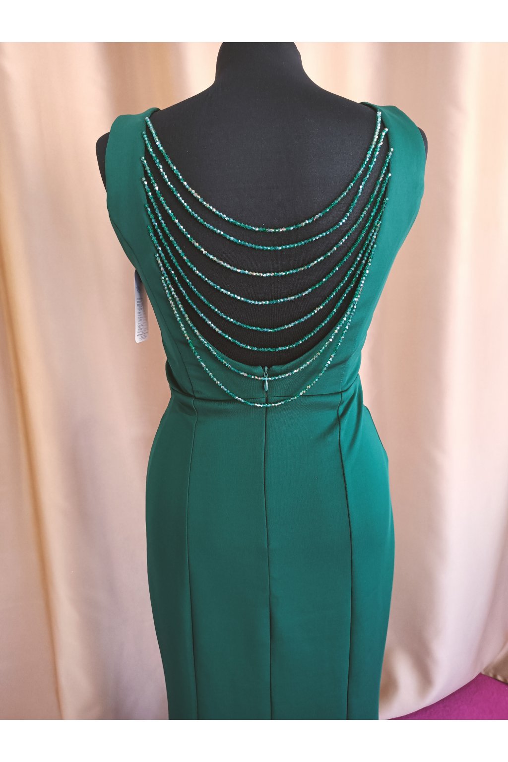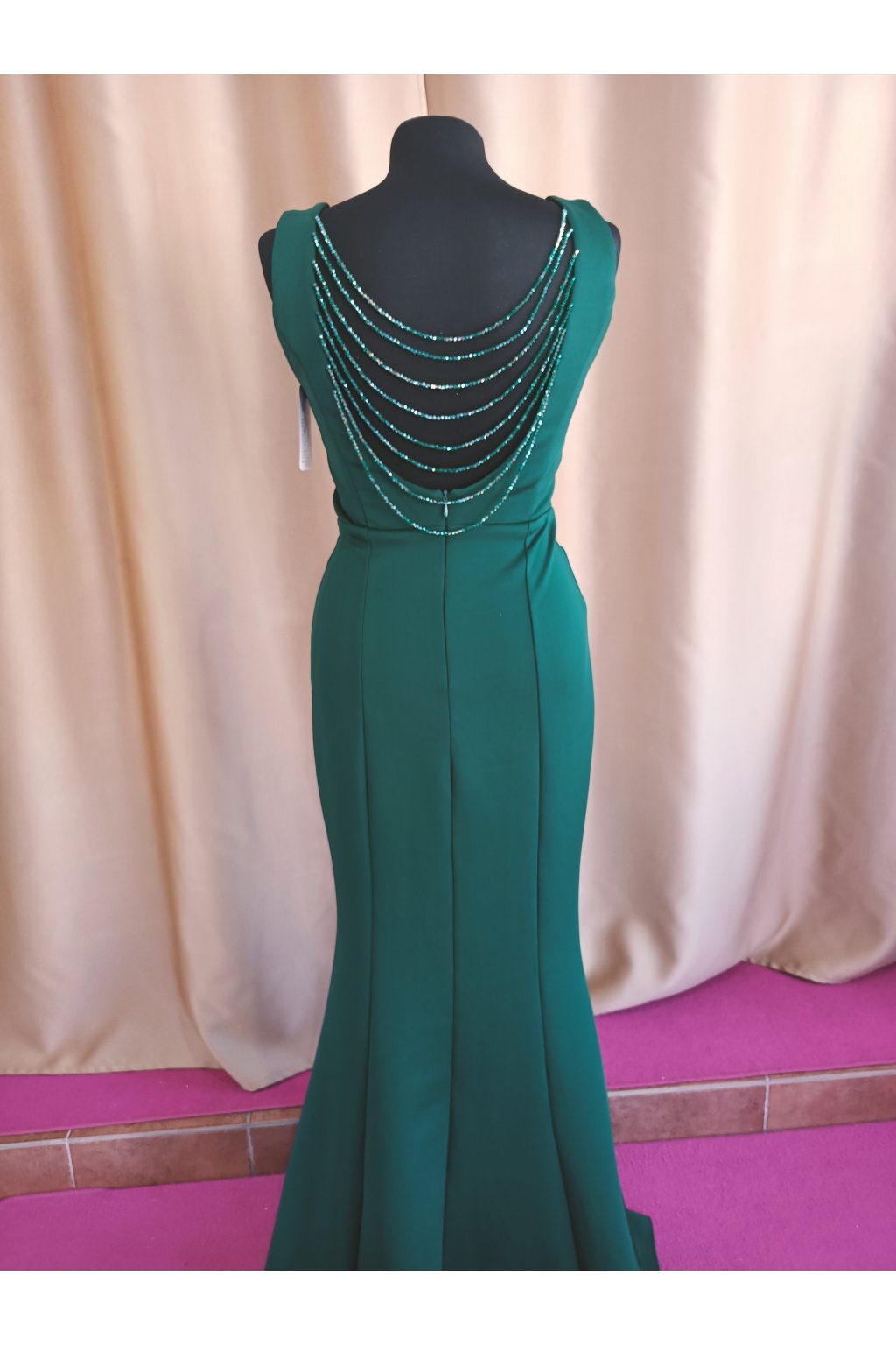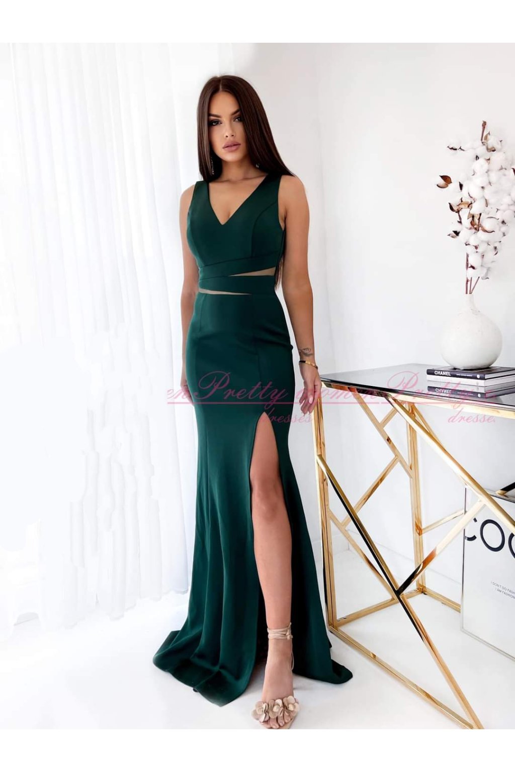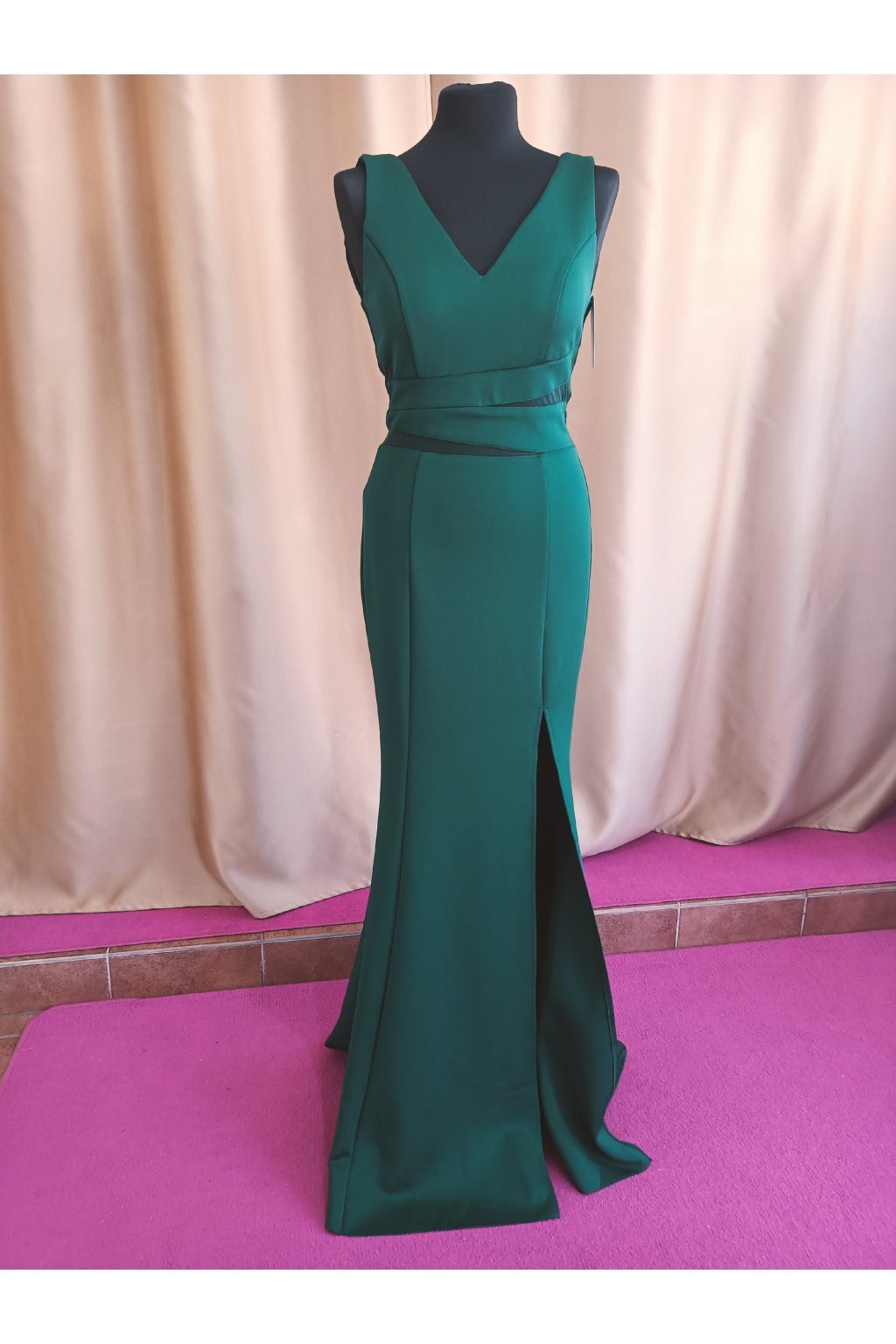 Exkluzívne dlhé priliehavé šaty vám padnú do oka už na prvý pohľad. Šaty sú na hrubšie ramienka a majú véčkový výstrih. Na prsiach sú vystužené. Pás je zdôraznený zaujímavým prepracovaním, kde telo zafinovane odhaľuje tyl. Chrbát s hlbokým výstrihom skrášlia kamienkové retiazky. Dlhá sukňa je na jednej strane rozstrihnutá. Šaty sa zapínajú pomocou zipsu.