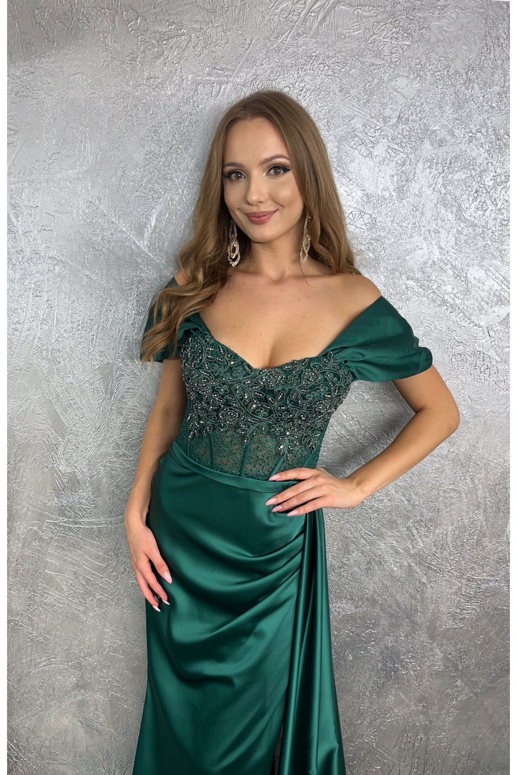 Dlhé spoločenské zelené saténové šaty s vyšívaným korzetom