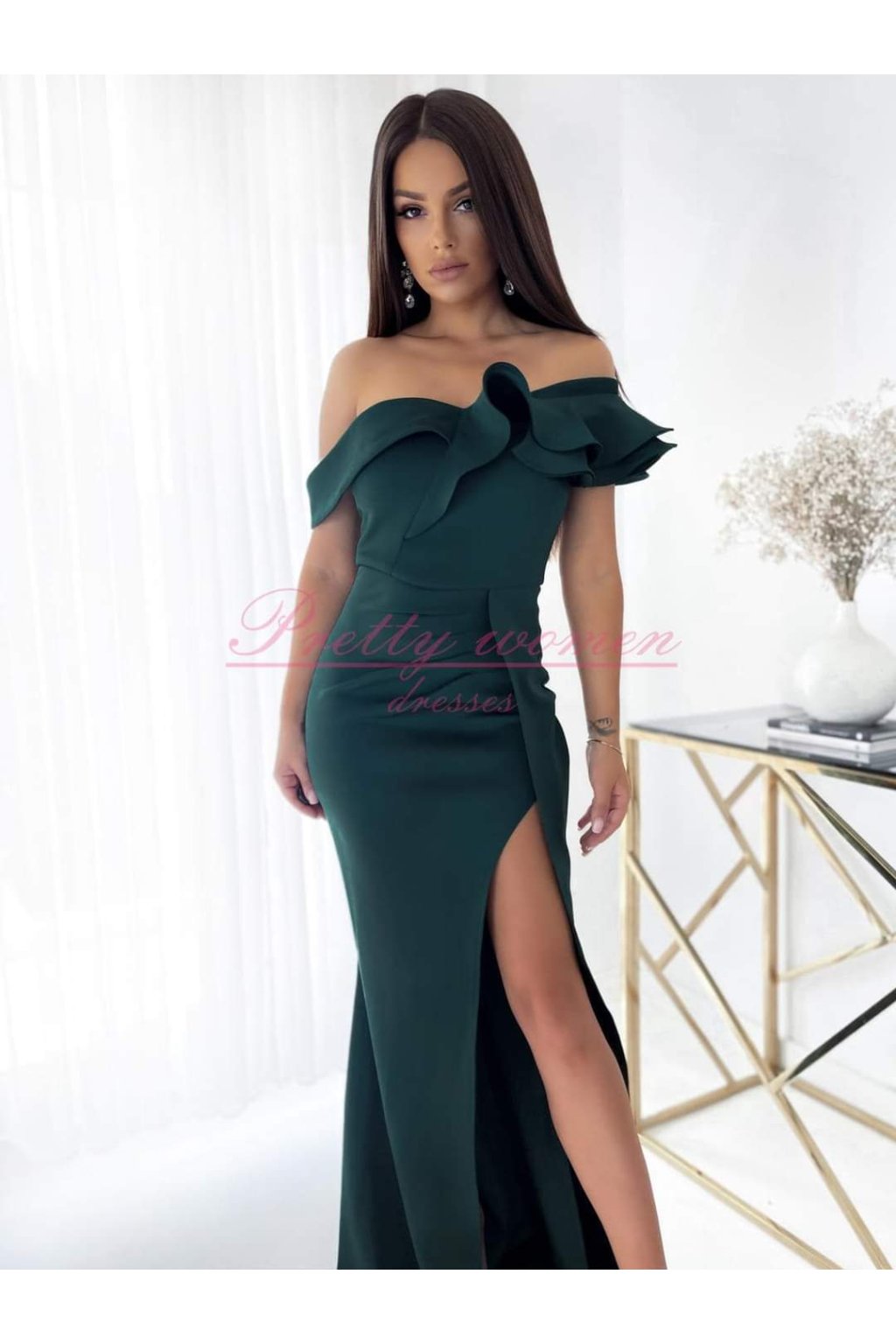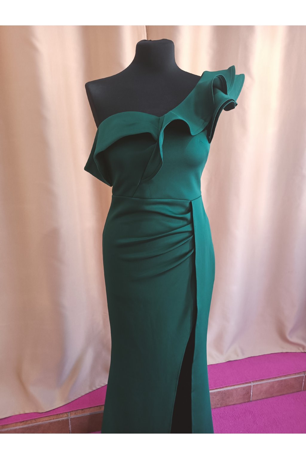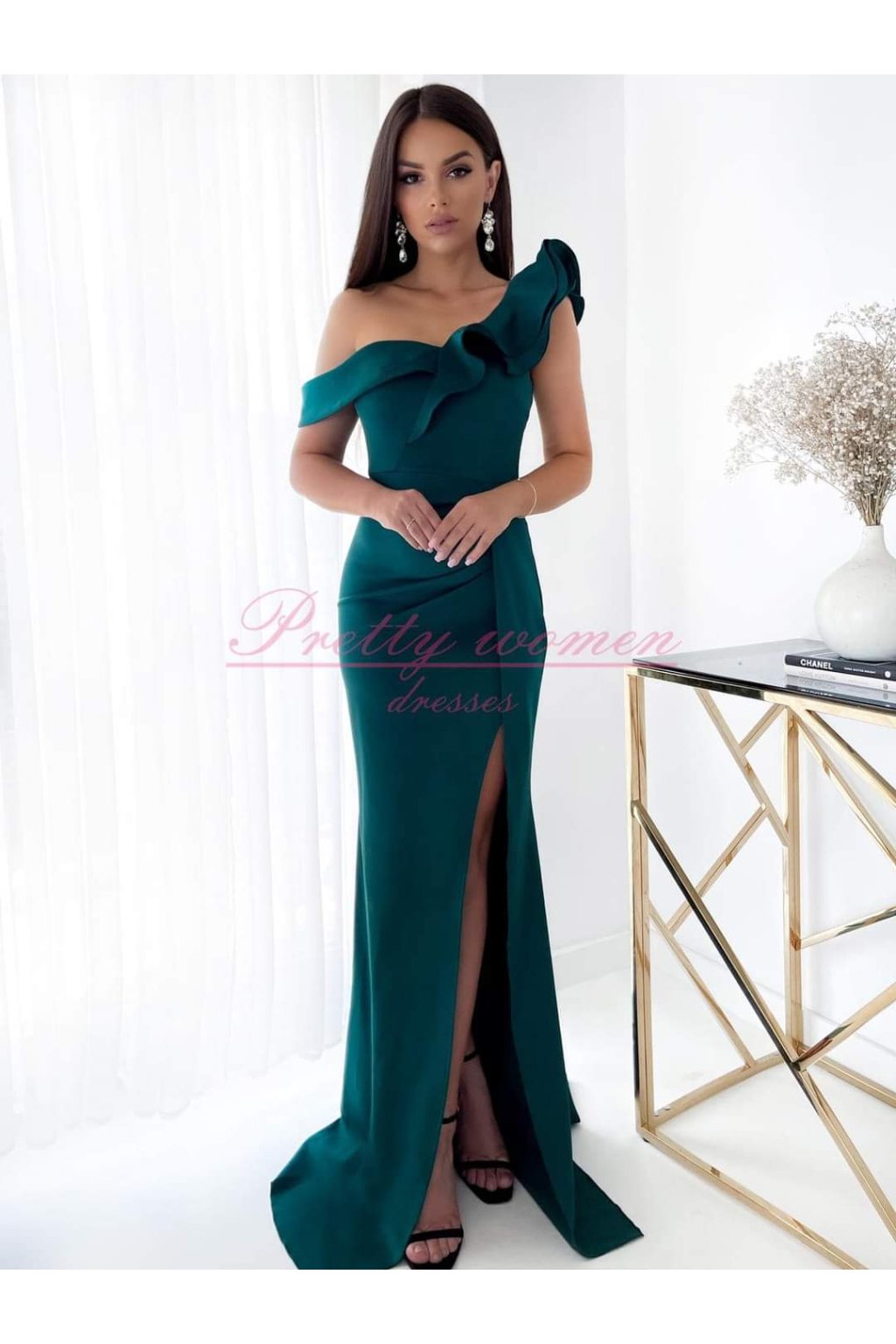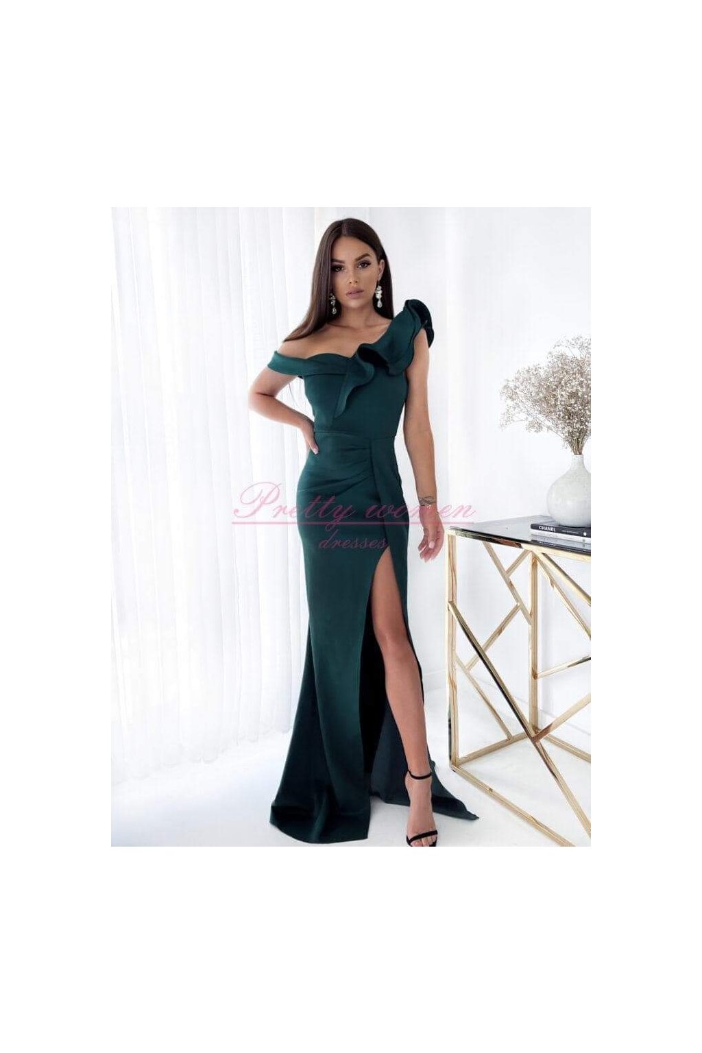 Dlhé spoločenské zelené šaty s volánom na jedno rameno