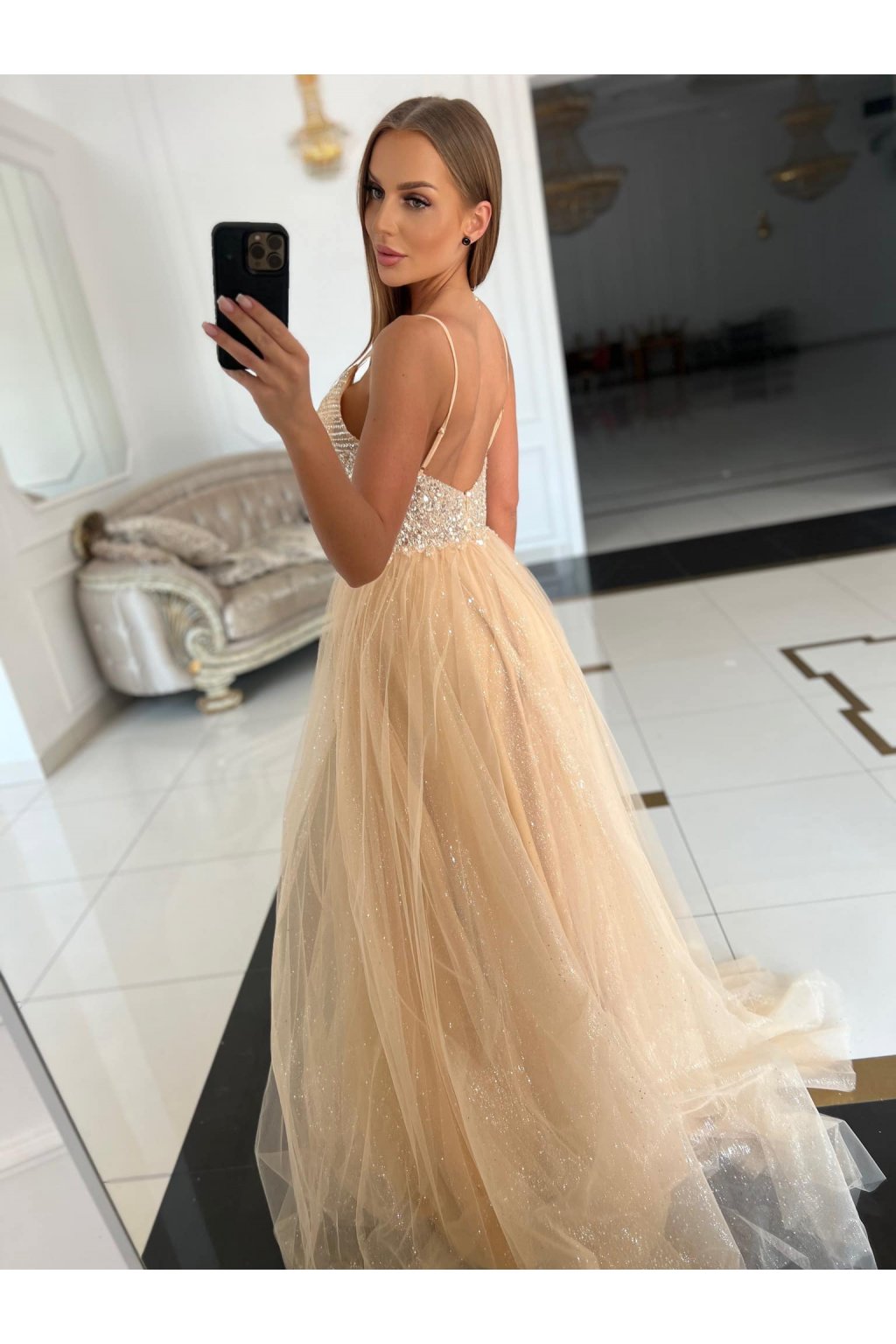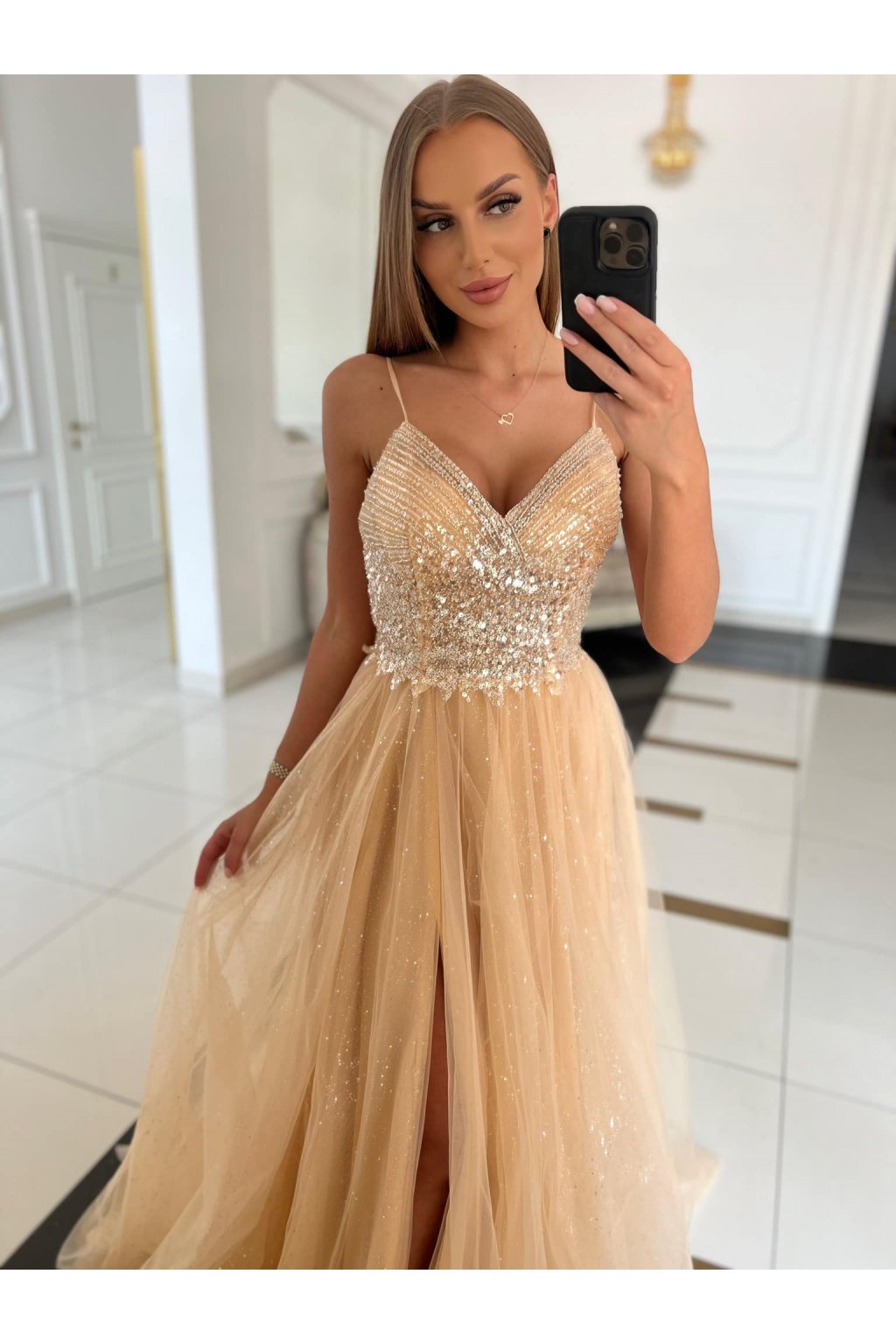 Dlhé spoločenské zlaté šaty s flitrami a tylovou sukňou