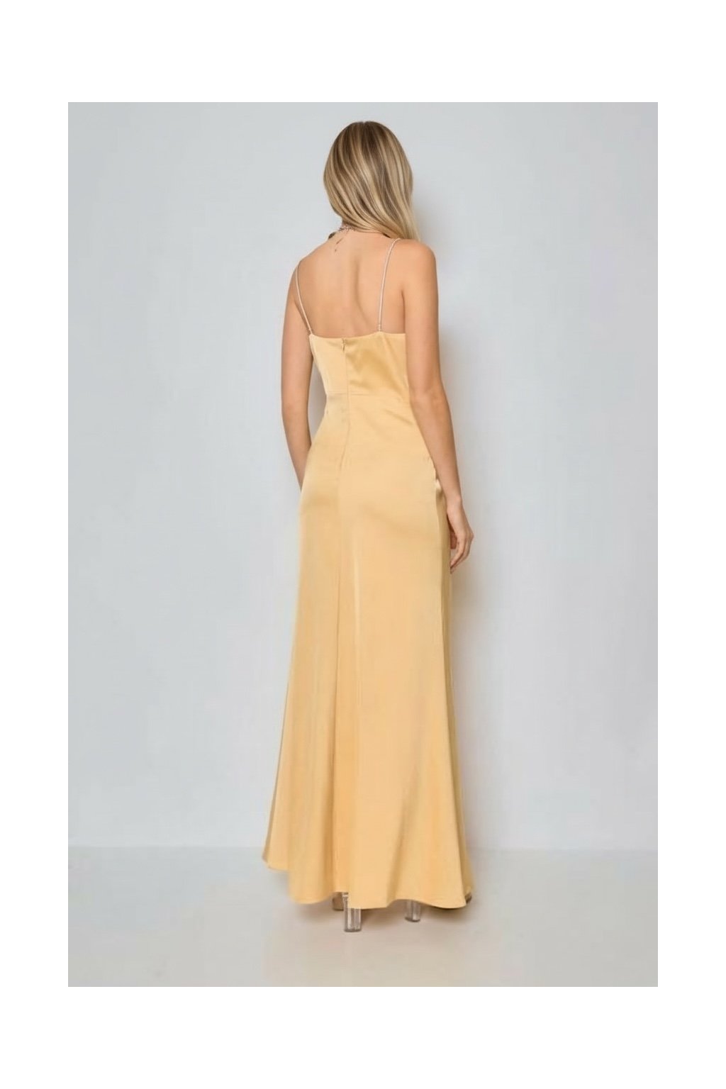 Dlhé šaty s kamienkovými ramienkami v sebe spájajú jednoduchosť a krásu. Príjemný, hladký materiál poteší Vašu pokožku. Šaty sú na prsiach vystužené. Sukňa je dlhá, priliehavá a na jednej strane má rázporok. Zapínanie na chrbte pomocou zipsu.