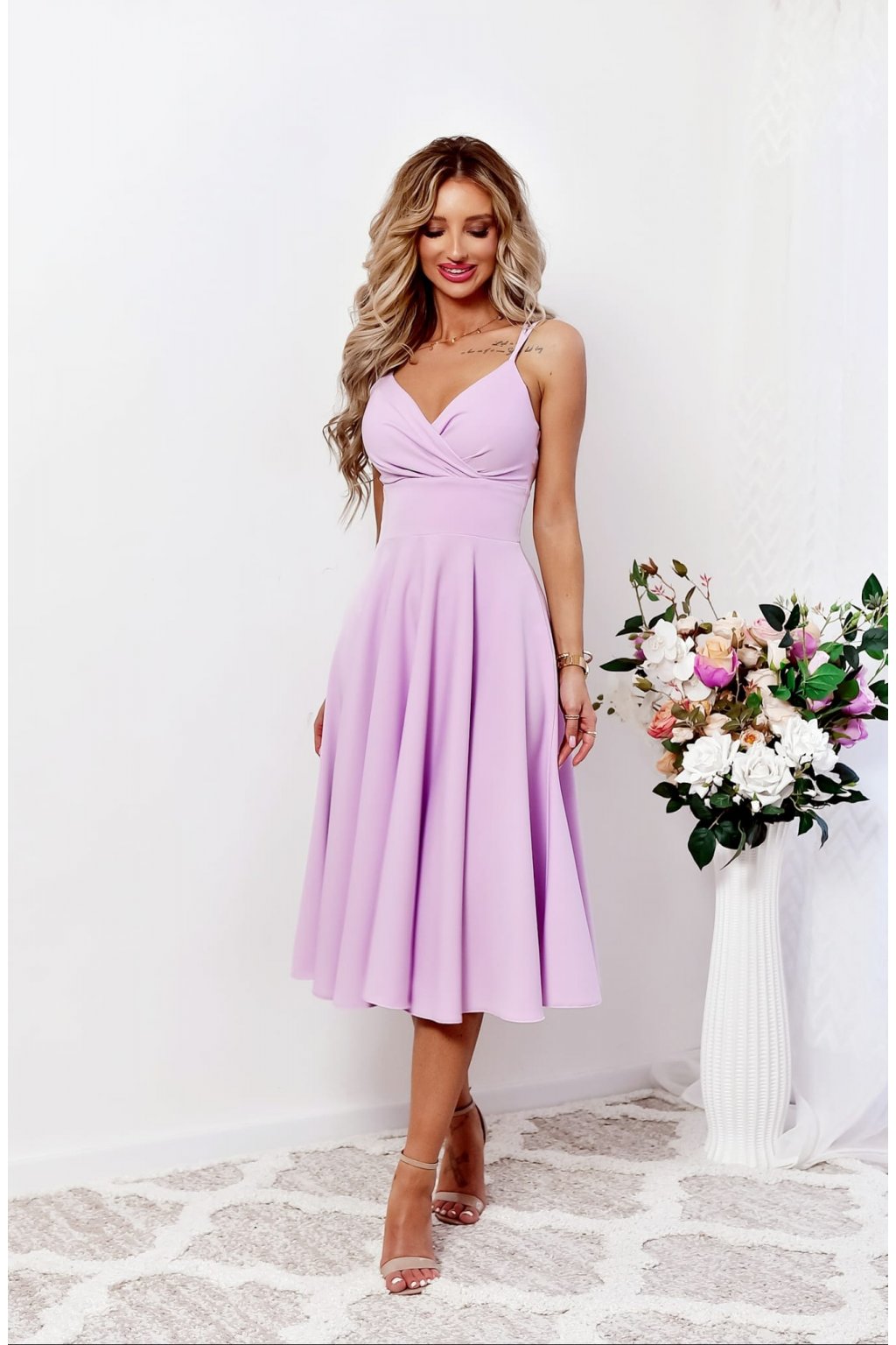 Fialové midi šaty na tenké ramienka