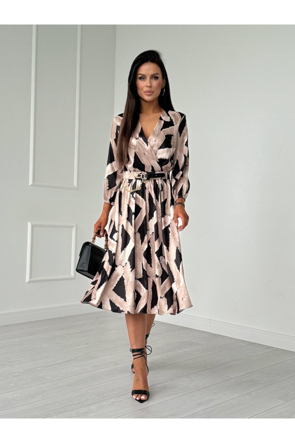 Tieto úžasné vzorované šaty Vám padnú do oka na prvý pohľad. Šaty majú trojštvrťový rukáv ukončený gumičkou. Chrbát je zakrytý. Výstrih je prekladaný, véčkový. Šaty nie sú na prsiach vystužené. Sukňa je padavá. Zapínajú sa na boku na zips. Súčasťou šiat je opasok.