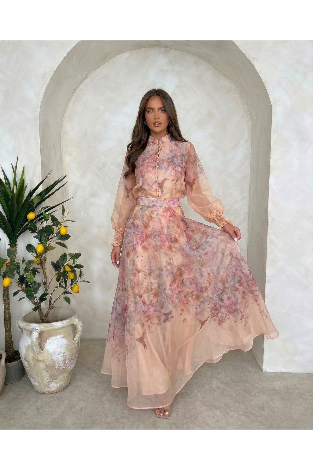 Blúzka je vyrobená z ľahkého, vzdušného materiálu s romantickým kvetinovým vzorom v nežných tónoch. Má dlhé, mierne nariasené rukávy zakončené jemnou manžetou a elegantné zapínanie na gombíky v prednej časti. Vysoký golier dodáva celkovému vzhľadu sofistikovaný nádych.