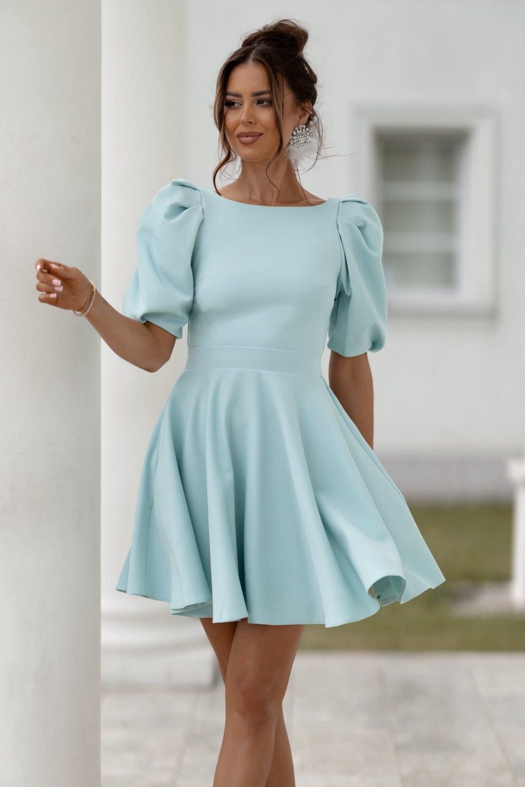 Mentolové šaty s puff rukávmi