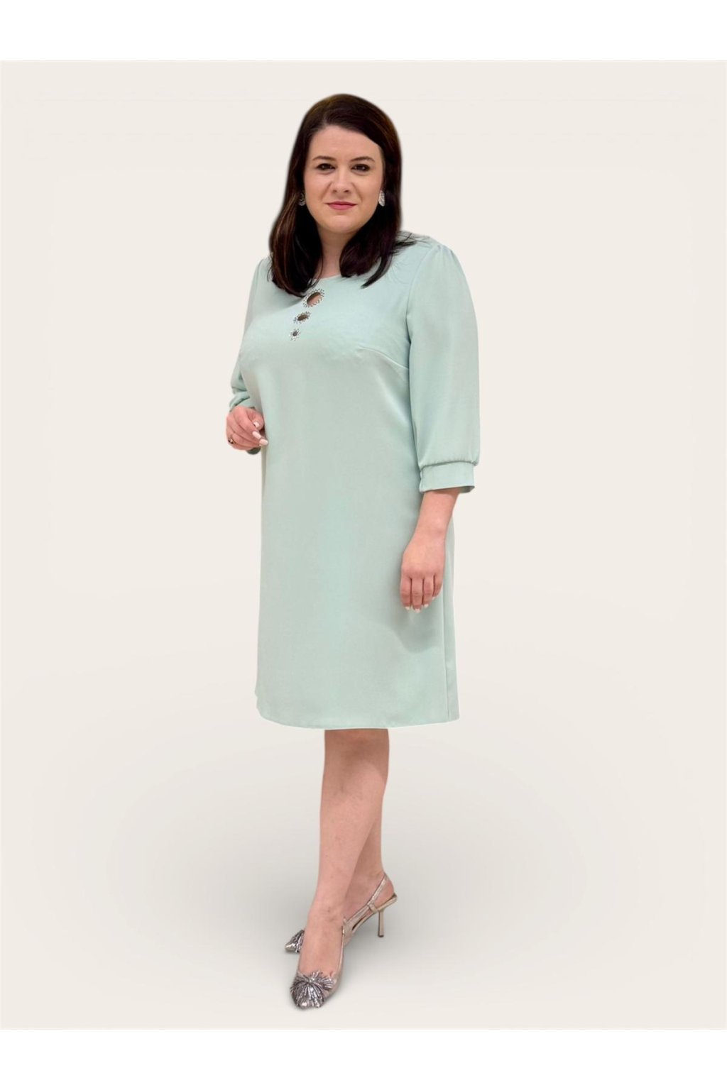 Elegantné dámske šaty v krásnom mentolovom odtieni sú ideálnou voľbou na svadby, rodinné oslavy a iné spoločenské udalosti. Puzdrový strih lichotí postave a zvýrazňuje ženskú siluetu, zatiaľ čo pohodlná dĺžka po kolená pôsobí vkusne a nadčasovo.