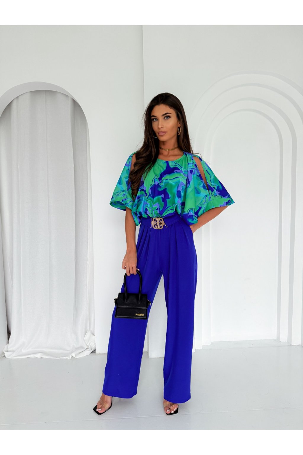 Buď jedinečná a trendy! Tento výnimočný kúsok ti to zabezpečí nielen na spoločenskej udalosti ale aj cez bežný deň, Vrch overalu má voľné rukávy, ktoré sú na boku prestrihnuté. Overal je v páse na gumičku, takže sa krásne prispôsobí. Na chrbte sa zapína na gombík. Má vrecká. Je doplnený opaskom, ktorý má zlatú pracku.