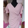 Tieto výnimočné šaty sú skvelou voľbou na svadbu, oslavu či inú spoločenskú udalosť. Majú prekladaný véčkový výstrih a na prsiach nie sú vystužené. V páse sa viažu. Neprehliadnuteľné a trendy volány tvoria jemný rukáv. Sukňa je padavá a prekladaná. Chrbát je zakrytý. Zapínajú sa zozadu na zips.