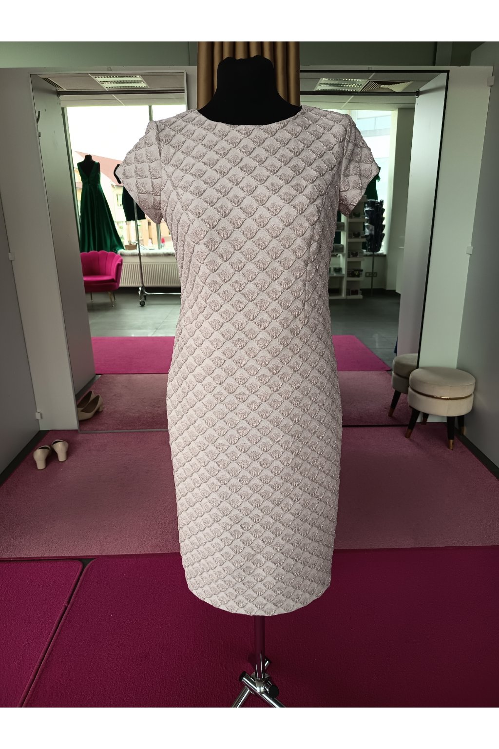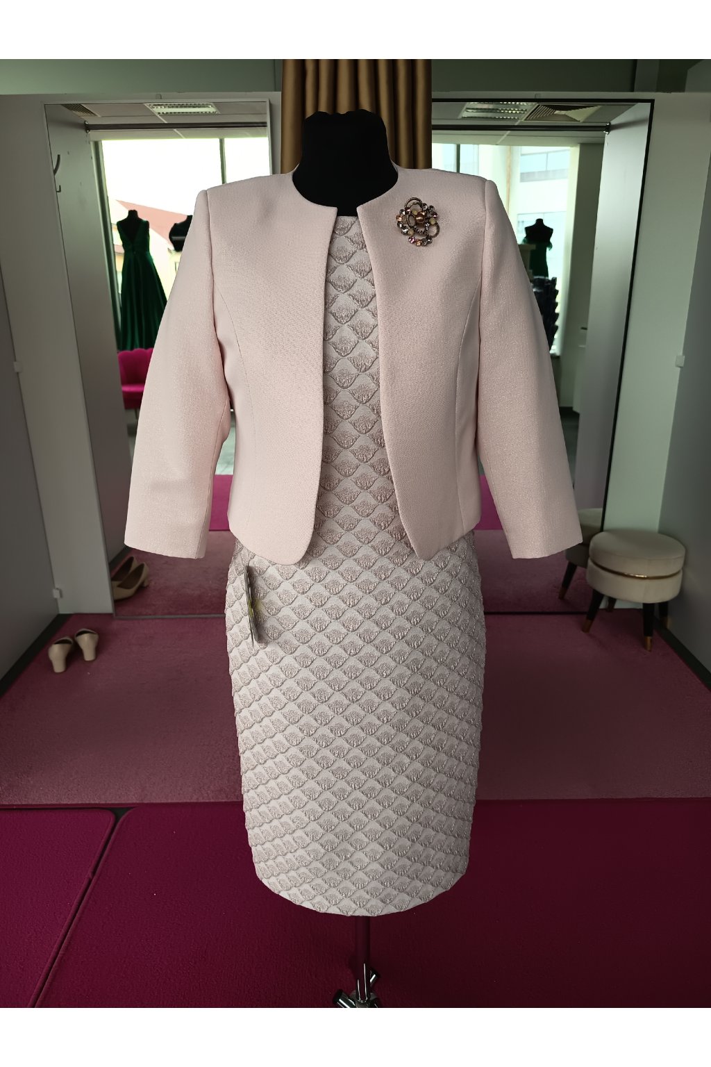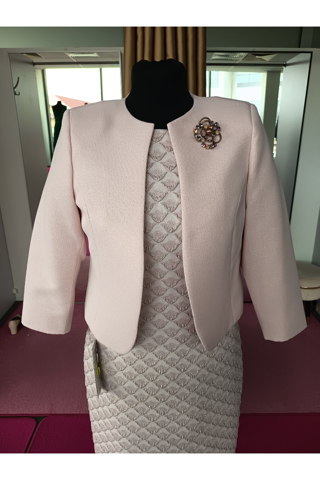 Ak hľadáte luxusný a noblesný kúsok ako svadobná mama či hosť, tento elegantný kostým je tá správna voľba. Kostým zaujme dokonalým elegantným vzhľadom a kvalitným materiálom. Púzdrové šaty majú krátky rukáv a zozadu sa zapínajú na zips. Vzadu majú malý rázporok. Sukňa má podšívku. Sako má trojštvrťový rukáv a nezapína sa. Je podšité. Na saku je odopínateľná brošňa. Sako má jemný trblietavý vzhľad.