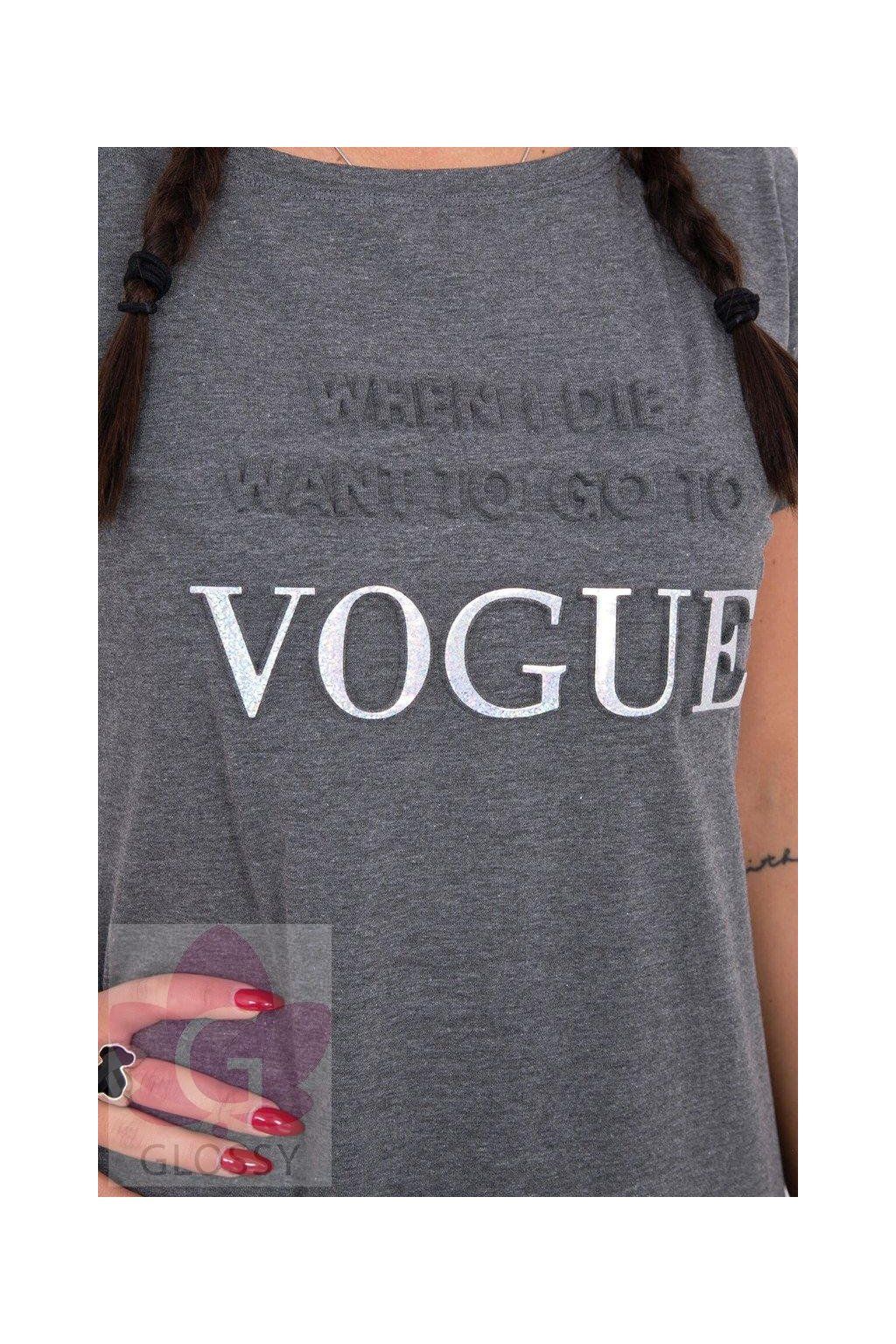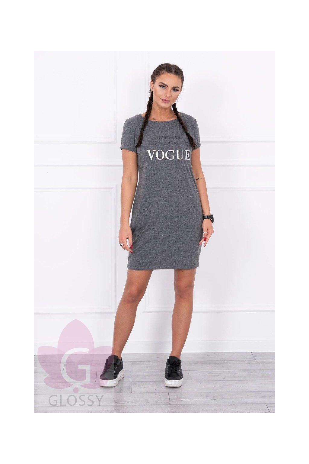 Šedé šaty s nápisom Vogue a vreckami.
