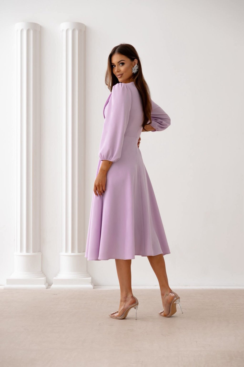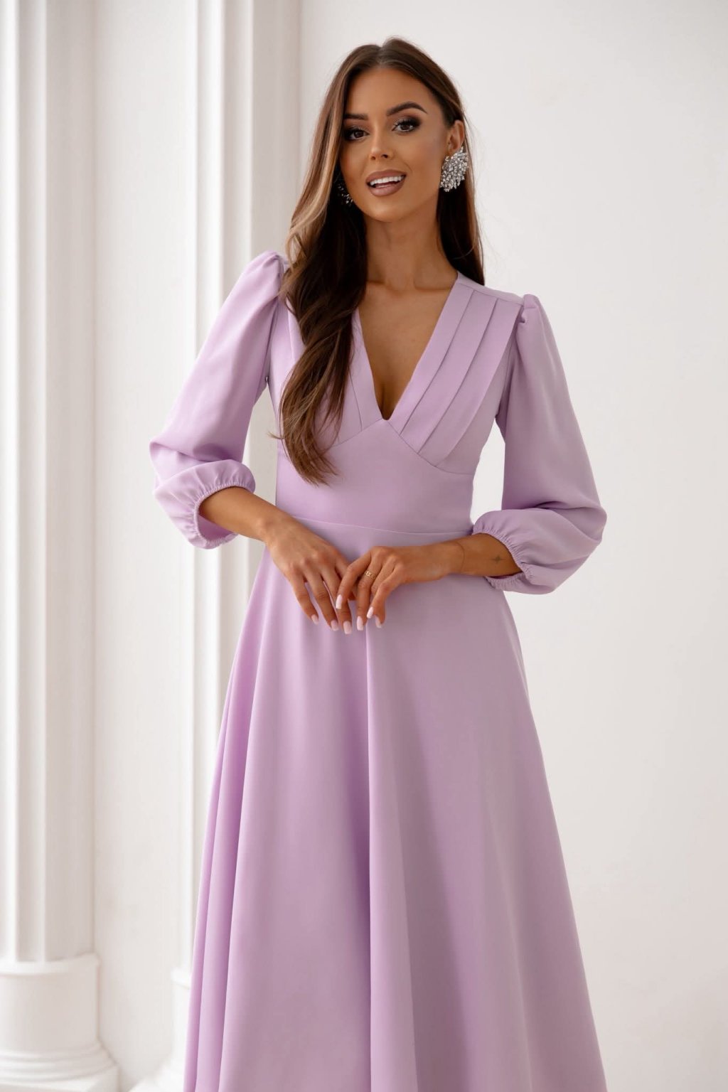 Elegantné, hladké midi šaty sú skvelou voľbou na svadby pre svadobné mamy, svadobných hostí či iné udalosti ako promócie či oslavy. Riasenie v oblasti dekoltu podčiarkuje hrubý pás, ktorý zvýrazňuje driek. Šaty nie sú na prsiach vystužené. Rukáv je trojštvrťový, ukončený gumičkou. Sukňa je padavá. Zapínajú sa na chrbte na zips.