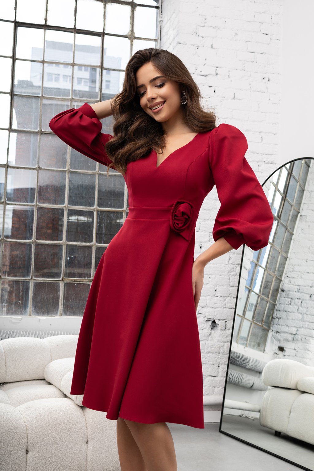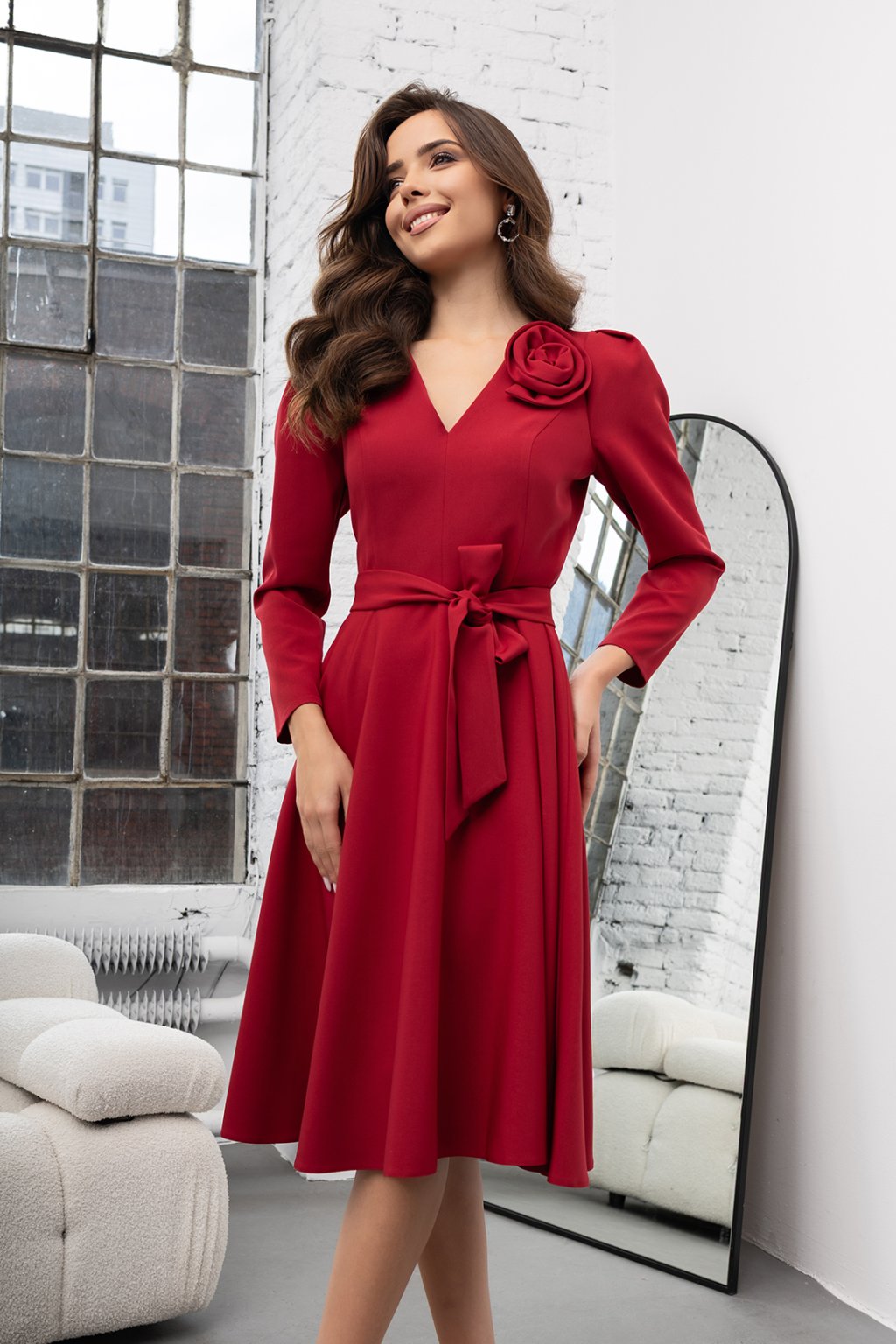Elegantné, hladké šaty sú skvelou voľbou na svadby, promócie, večierok či inú udalosť. Výstrih je véčkový a na prsiach nie sú vystužené. Rukáv je dlhý, ukončený manžetou. Pás je zdobený neodopínateľnou kvetinovou ozdobou. Chrbát je zakrytý. Sukňa je padavá. Zapínajú sa na chrbte na zips.