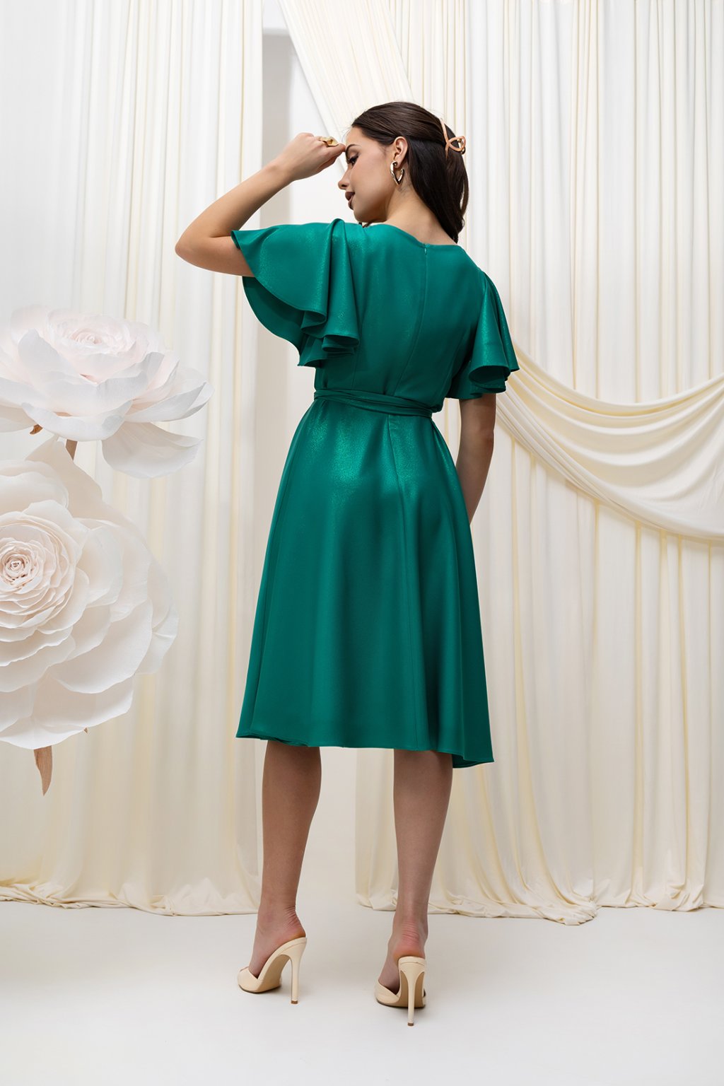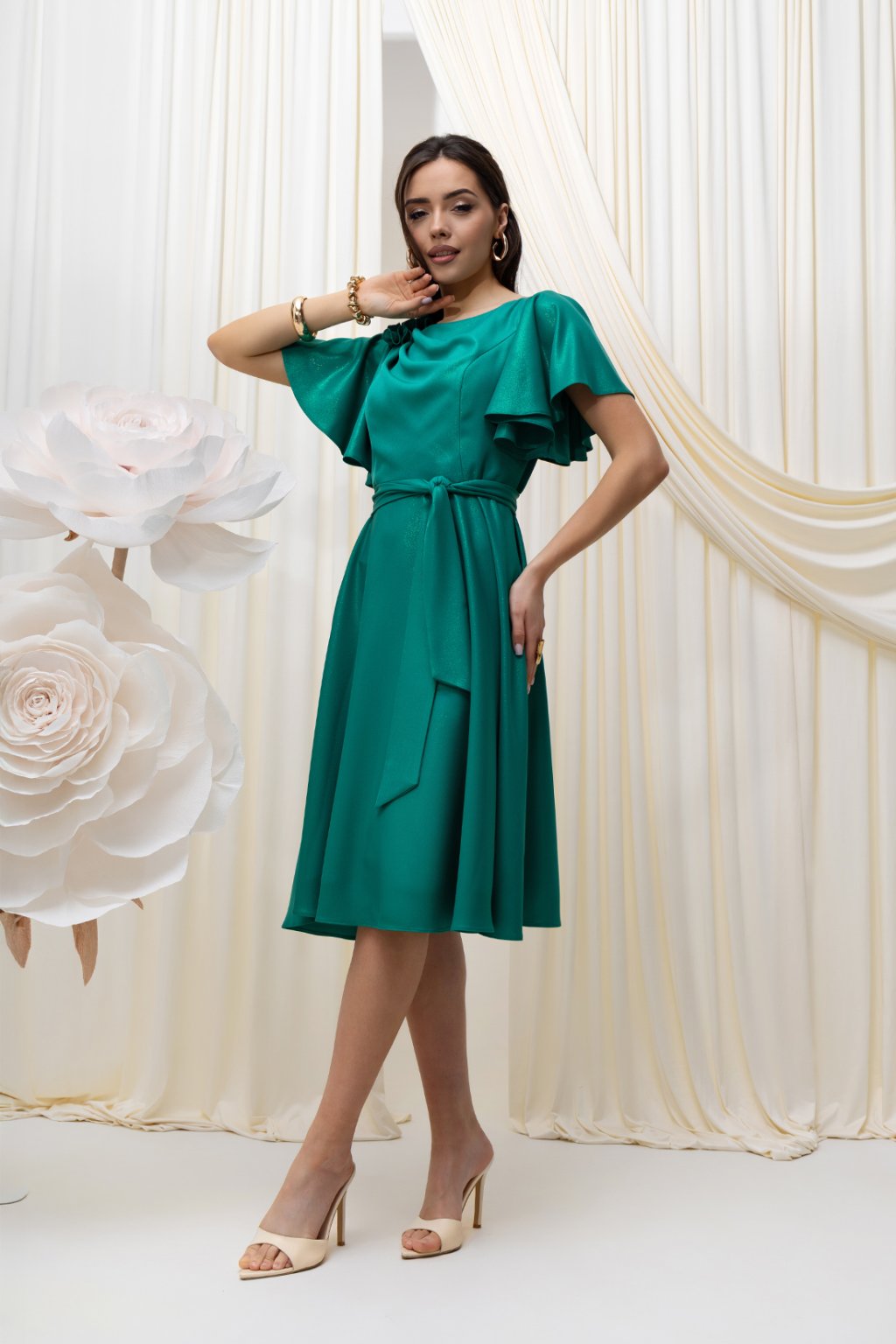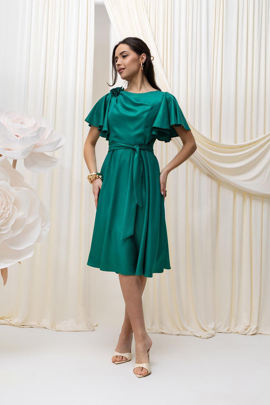 Tieto ženské šaty v sýtom smaragdovo-zelenom odtieni sú ideálnou voľbou na spoločenské udalosti, oslavy aj formálnejšie príležitosti. Jemne splývavý materiál pôsobí luxusne a pohodlne zároveň, zatiaľ čo krátke volánové rukávy dodávajú modelu ľahkosť a romantický nádych.